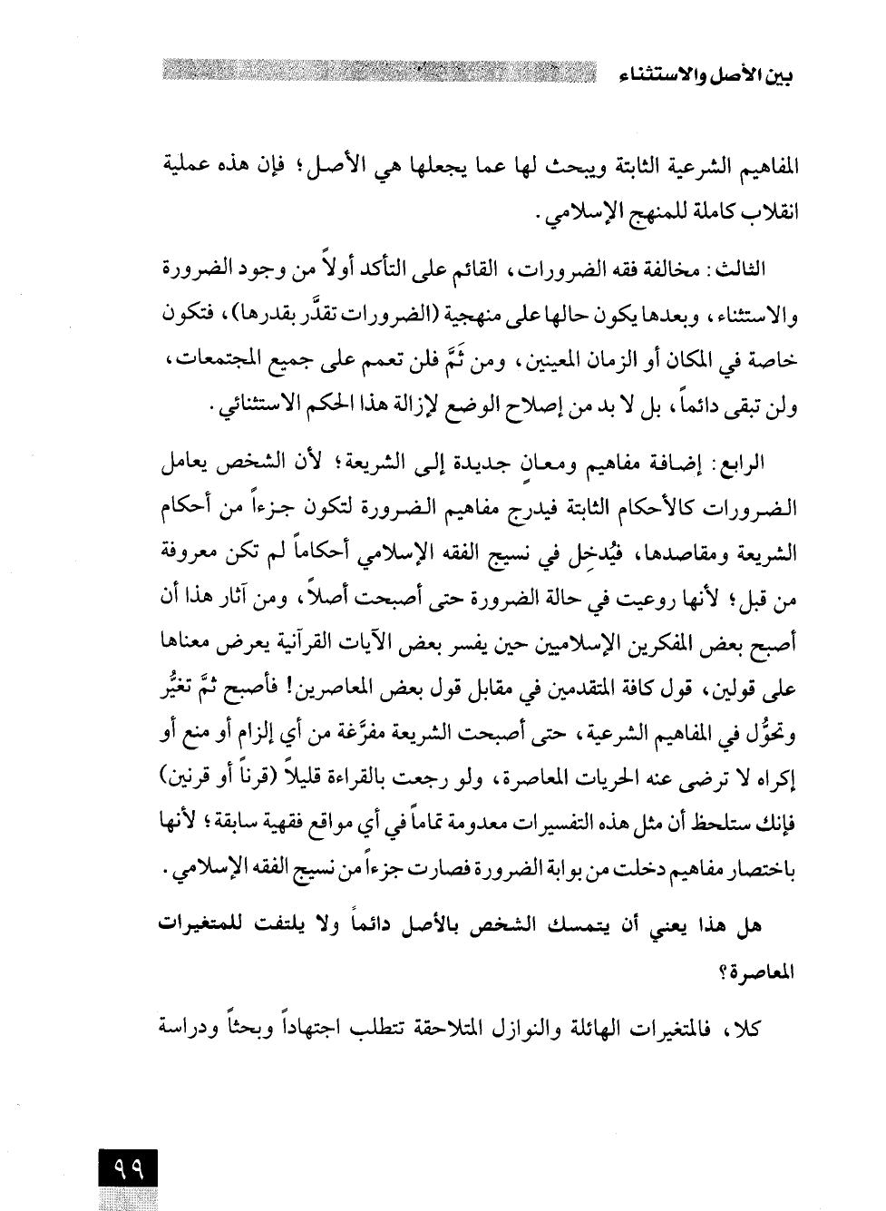 الثالث: مخالفة فقه الضرورات، القائم على التأكد أولًا من وجود الضرورة والاستثناء، وبعدها يكون حا لها على منهجية (الضرورات تقدَّر بقدرها)، فتكون خاصة في المكان أو الزمان المعينين، ومن ثَمَّ فلن تعمم على جميع المجتمعات، ولن تبقى دائمًا، بل لا بد من إصلاح الوضع لإزالة هذا الحكم الاستثنائي.