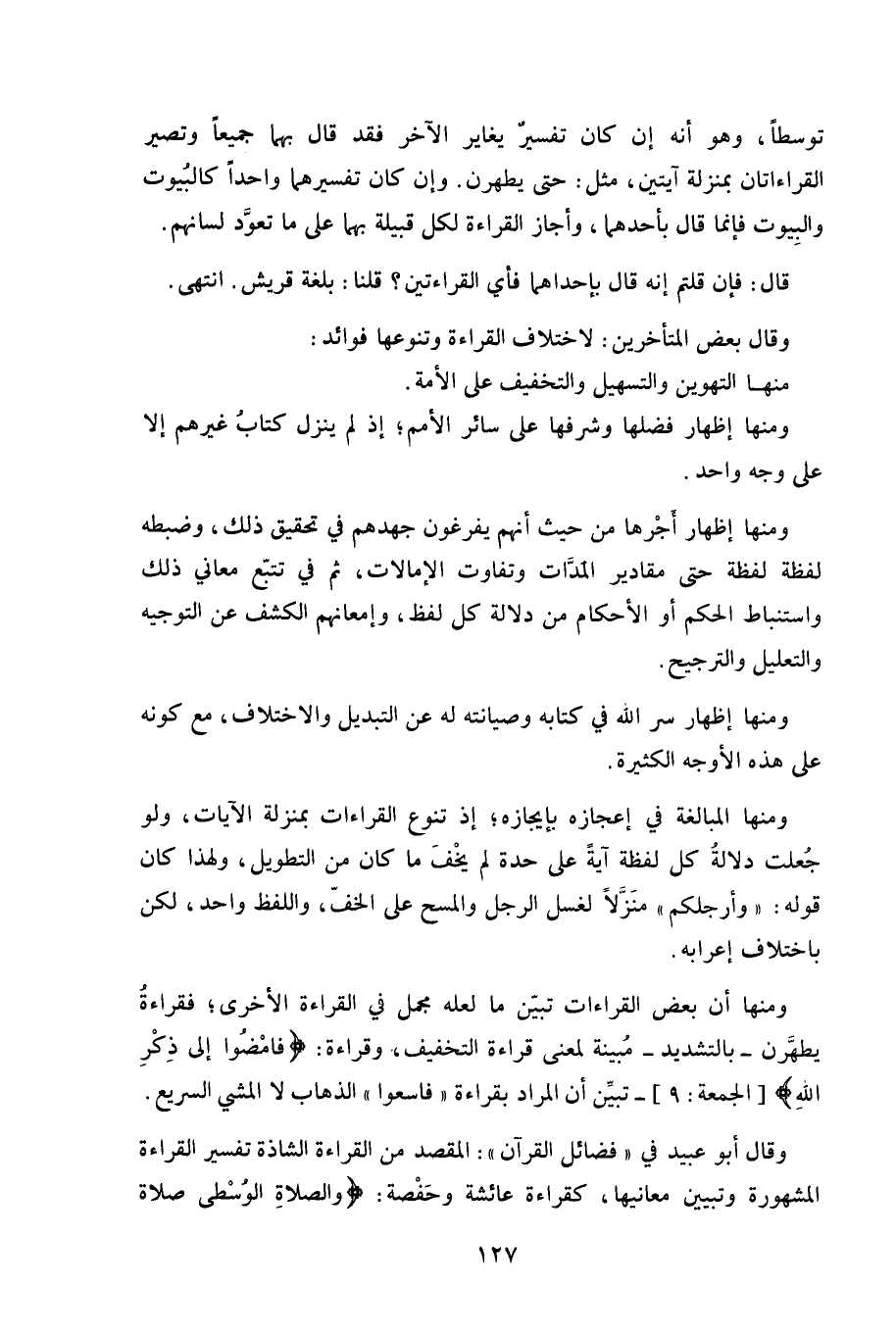 وقال أبو عبيد في " فضائل القرآن ": القصد من القراءة الشاذة تفسير القراءة المشهورة وتبيين معانيها،