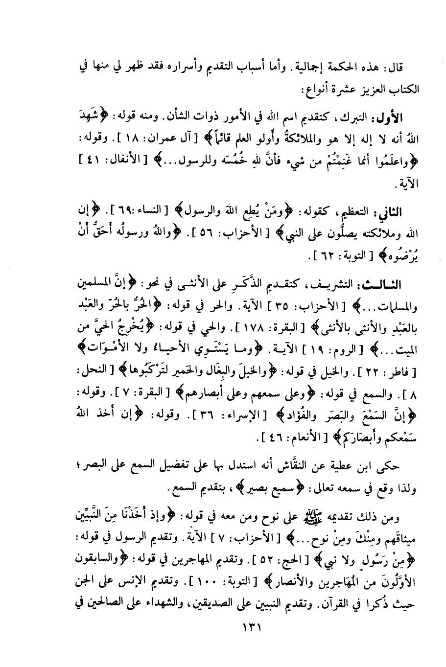 الثالث: التشريف، كتقديم الذَّكَرِ على الأنثى في نحو: (إنَّ المسلمين