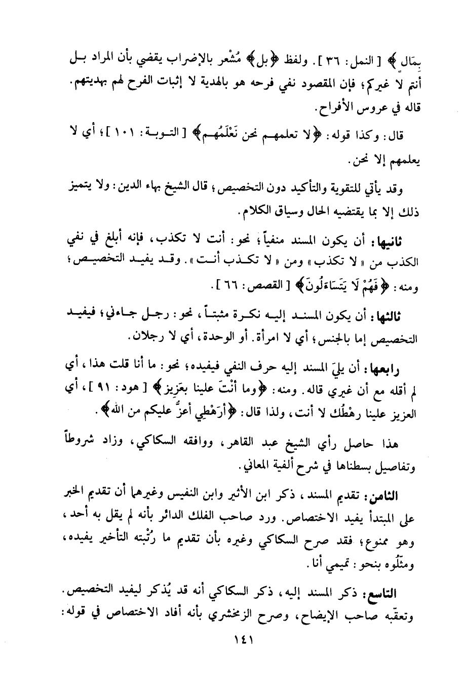 التاسع: ذكر المسند إليه، ذكر السكاكي أنه قد يُذكر ليفيد التخصيص.