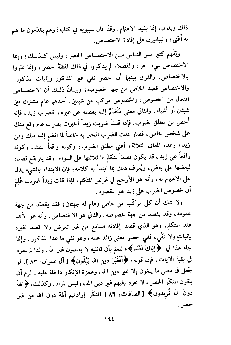 والثاني هو الاختصاص، وأنه هو الأهم عند المتكلم، وهو الذي قصد إفادته السامع من غير تعرض ولا قصد لغيره لإثباب ولا نَفْي، ففي الحصر معنى زائد عليه، وهو نفي ما عدا المذكور، وإنما جاء هذا في: (إيّاكَ نَعْبُد) ، للعلم بأن قائليه لا يعبدون غير الله، ولذا لم يطرد في بقية الآيات.