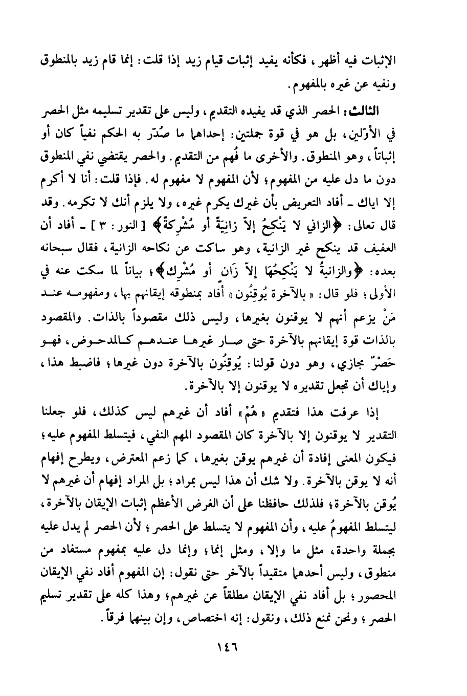 فإذا قلت: أنا لا أكرم إلا إياك - أفاد التعريض بأن غيرك يكرم غيره، ولا يلزم أنك لا تكرمه، وقد قال تعالى: (الزَّانِي لَا يَنْكِحُ إِلَّا زَانِيَةً أَوْ مُشْرِكَةً) . - أفاد أن العفيف قد ينكح غير الزانية، وهو ساكت عن نكاحه الزانية، فقال سبحانه بعده: (والزانية لا يَنْكحُهَا إلاّ زَان أو مُشْرِك) ، بياناً لما سكت عنه في الأولى، فلو قال: " بالآخرة يوقِنون " أفاد بمنطوقه إيقانهم بها، ومفهومه عند مَنْ يزعم أنهم لا يوقنون بغيرها، وليس ذلك مقصوداً بالذات.