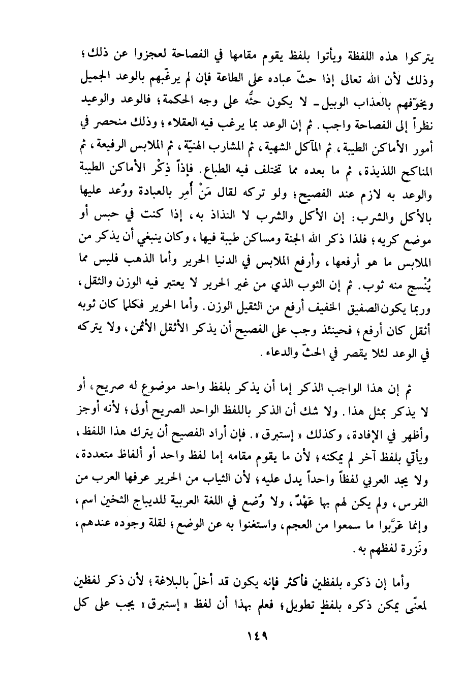 فإن أراد الفصيح أن يترك هذا اللفظ، ويأتي بلفظ آخر لم يمكنه، لأن ما يقوم مقامه إما لفظ واحد أو ألفاظ متعددة، ولا يجد العربي لفظا واحداً يدل عليه، لأن الثياب من الحرير عرفها العرب من الفرس، ولم يكن لهم بها عَهْدٌ، ولا وُضع في اللغة العربية للديباج الثخين اسم، وإنما عَرَّبوا ما سمعوا من العجم، واستغنوا به عن الوضع، لقلة وجوده عندهم، ونَزرة لفظهم به.