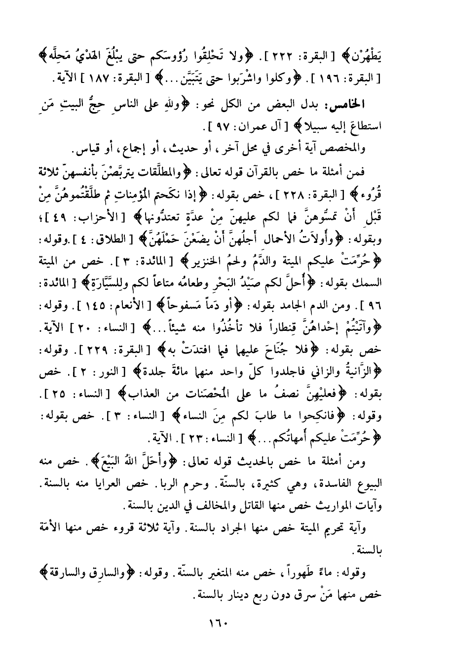 فمن أمثلة ما خص بالقرآن قوله تعالى: (وَالْمُطَلَّقَاتُ يَتَرَبَّصْنَ بِأَنْفُسِهِنَّ ثَلَاثَةَ قُرُوءٍ) .، خص بقوله: (إِذَا نَكَحْتُمُ الْمُؤْمِنَاتِ ثُمَّ طَلَّقْتُمُوهُنَّ مِنْ قَبْلِ أَنْ تَمَسُّوهُنَّ فَمَا لَكُمْ عَلَيْهِنَّ مِنْ عِدَّةٍ تَعْتَدُّونَهَا) .