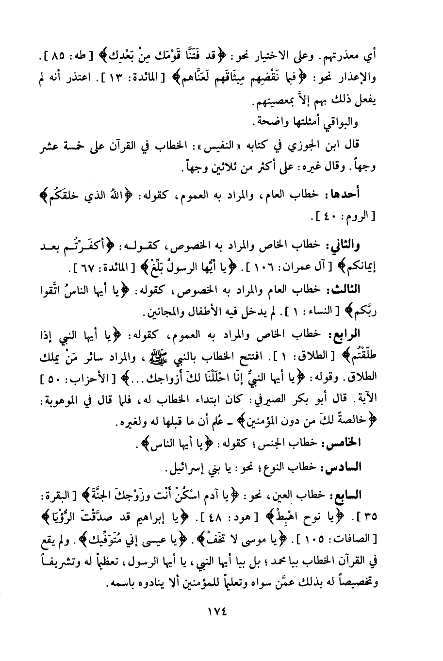 قال ابن الجوزي في كتابها "النفيس": الخطاب في القرآن على خمسة عشر