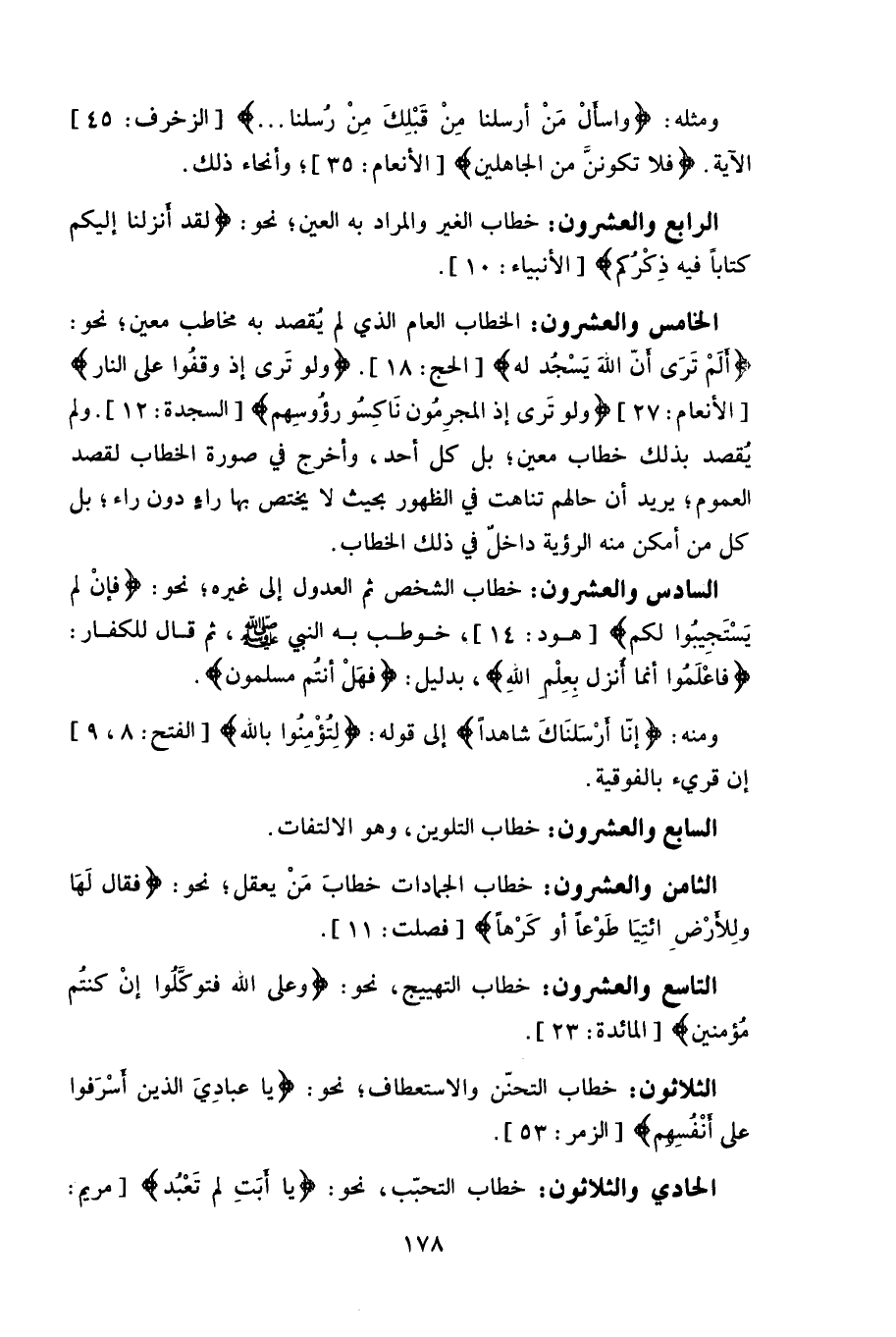 السادس والعشرون: خطاب الشخص ثم العدول إلى غيره، نحو: (فَإِلَّمْ يَسْتَجِيبُوا لَكُمْ) ، خوطب به النبي - صلى الله عليه وسلم -، ثم قال للكفار: (فَاعْلَمُوا أَنَّمَا أُنْزِلَ بِعِلْمِ اللَّهِ) ، بدليل: (فهَلْ أنتُم مسلمون) .