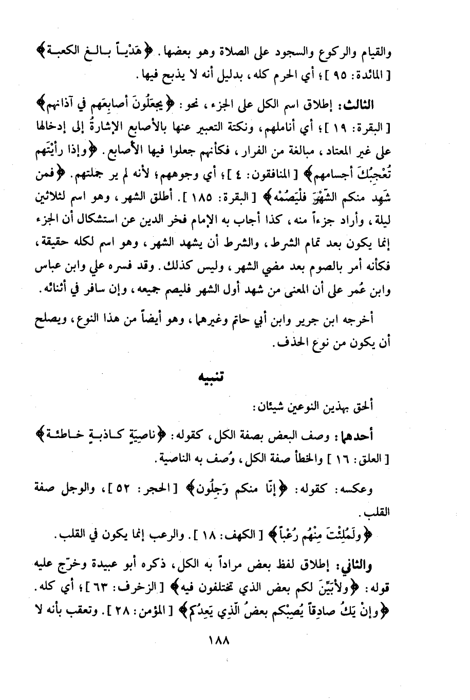 الثالث: إطلاق اسم الكل على الجزء، نحو: (يَجْعَلُونَ أَصَابِعَهُمْ فِي آذَانِهِمْ)