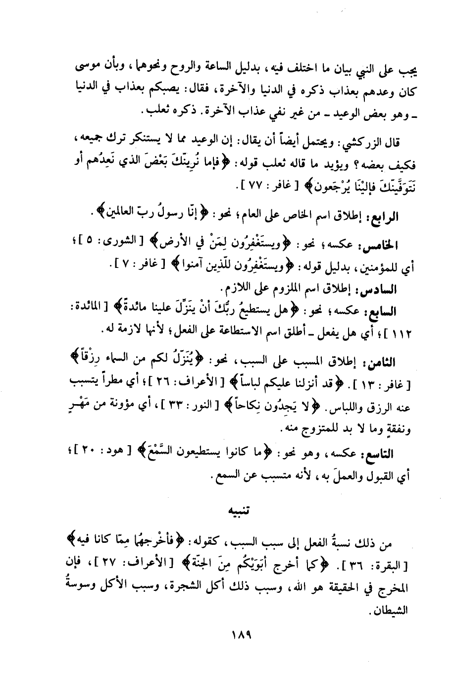 التاسع: عكسه، وهو نحو: (مَا كَانُوا يَسْتَطِيعُونَ السَّمْعَ) ، أي القبول والعملَ به، لأنه متسبب عن السمع.