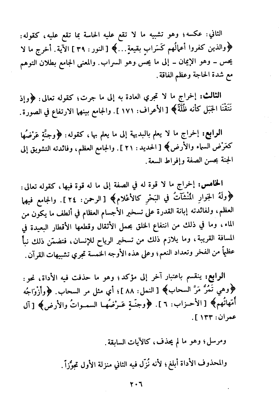 والجامع فيهما العظم، ولفائدته إبانة القدرة على تسخير الأجسام العظام في ألطف ما يكون من الماء، وما في ذلك من انتفاع الخلق بحمل الأثقال وقطعها الأقطار البعيدة في المسافة القريبة، وما يلازم ذلك من تسخير الرياح للإنسان، فتضمّن ذلك نبأ عظيما من الفخر وتعداد النعم، وعلى هذه الأوجه الخمسة تجرى تشبيهات القرآن.