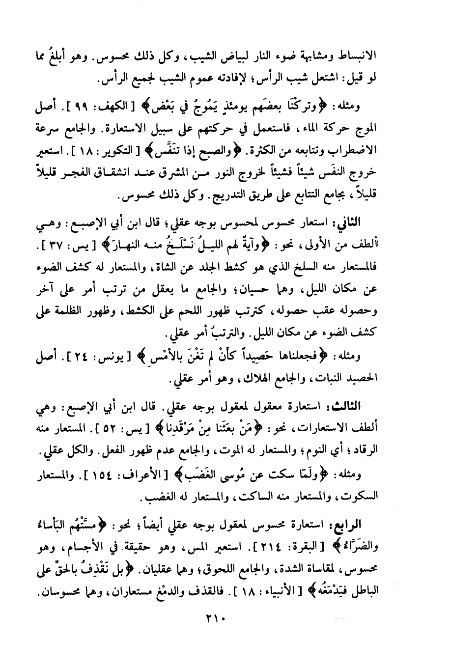 الثاني: استعار محسوس لمحسوس بوجه عقلي، قال ابن أبي الإصبع: وهي