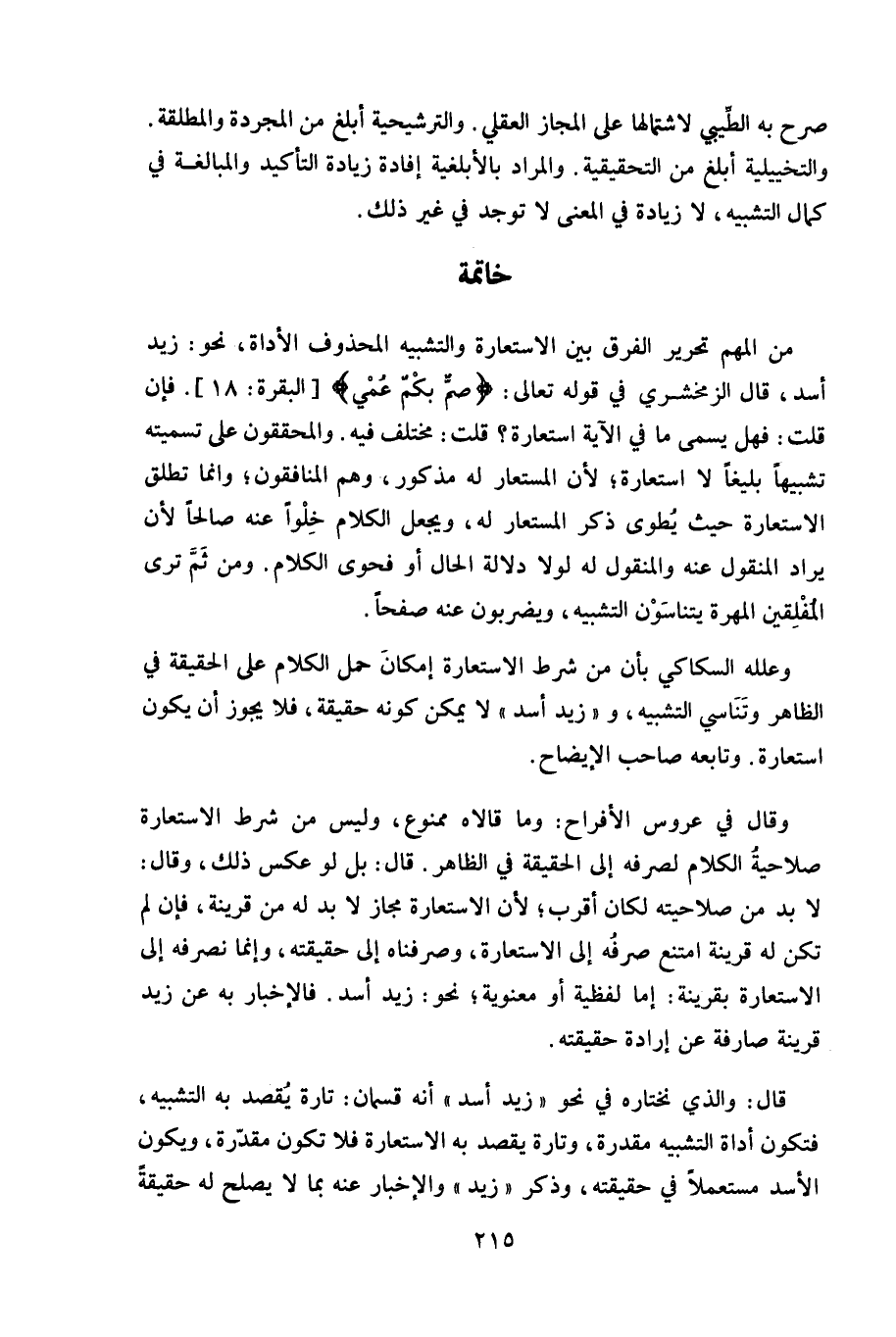 فتكون أداة التشبيه مقدرة، وتارة يقصد به الاستعارة فلا تكون مقدّرة، ويكون الأسد مستعملاً في حقيقته، وذكر " زيد " والإخبار عنه بما لا يصلح له حقيقةً