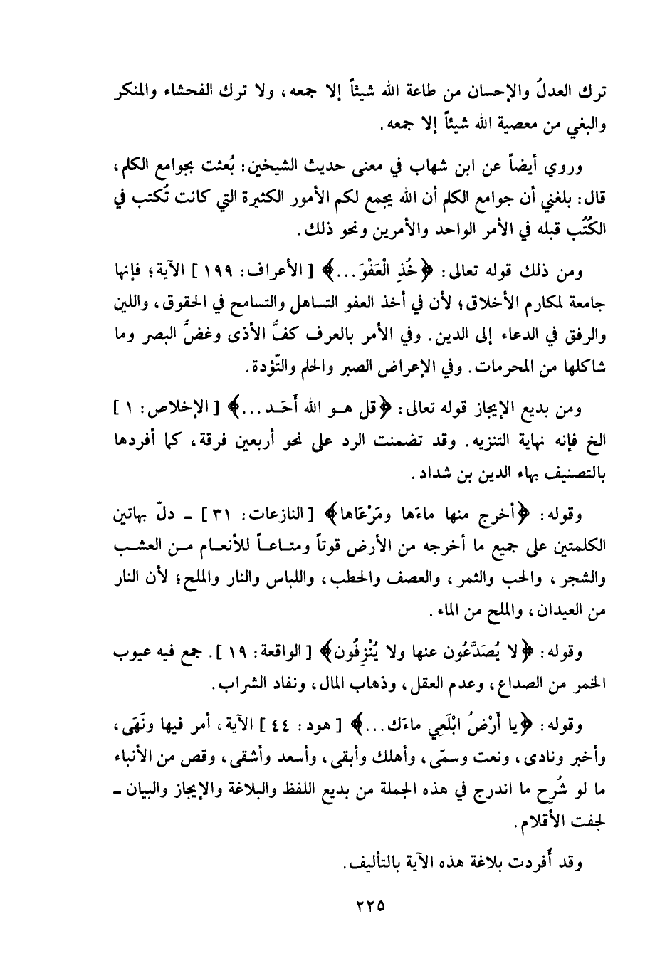 أمر فيها ونَهَى، وأخبر ونادى، ونعت وسمَّى، وأهلك وأبقى، وأسعد وأشقى، وقص من الأنباء ما لو شُرِح ما اندرج في هذه الجملة من بديع اللفظ والبلاغة والإيجاز والبيان لجفت الأقلام.