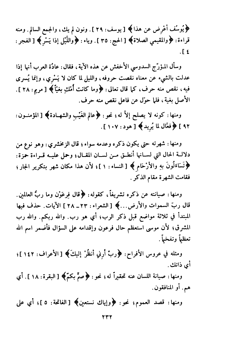 ومنها: شهرته حتى يكون ذكره وعدمه سواء، قال الزمخشري: وهو نوع من دلالة الحال التي لسانها أنطؤ من لسان المقال، وحمل عليه قراءة حمزة: