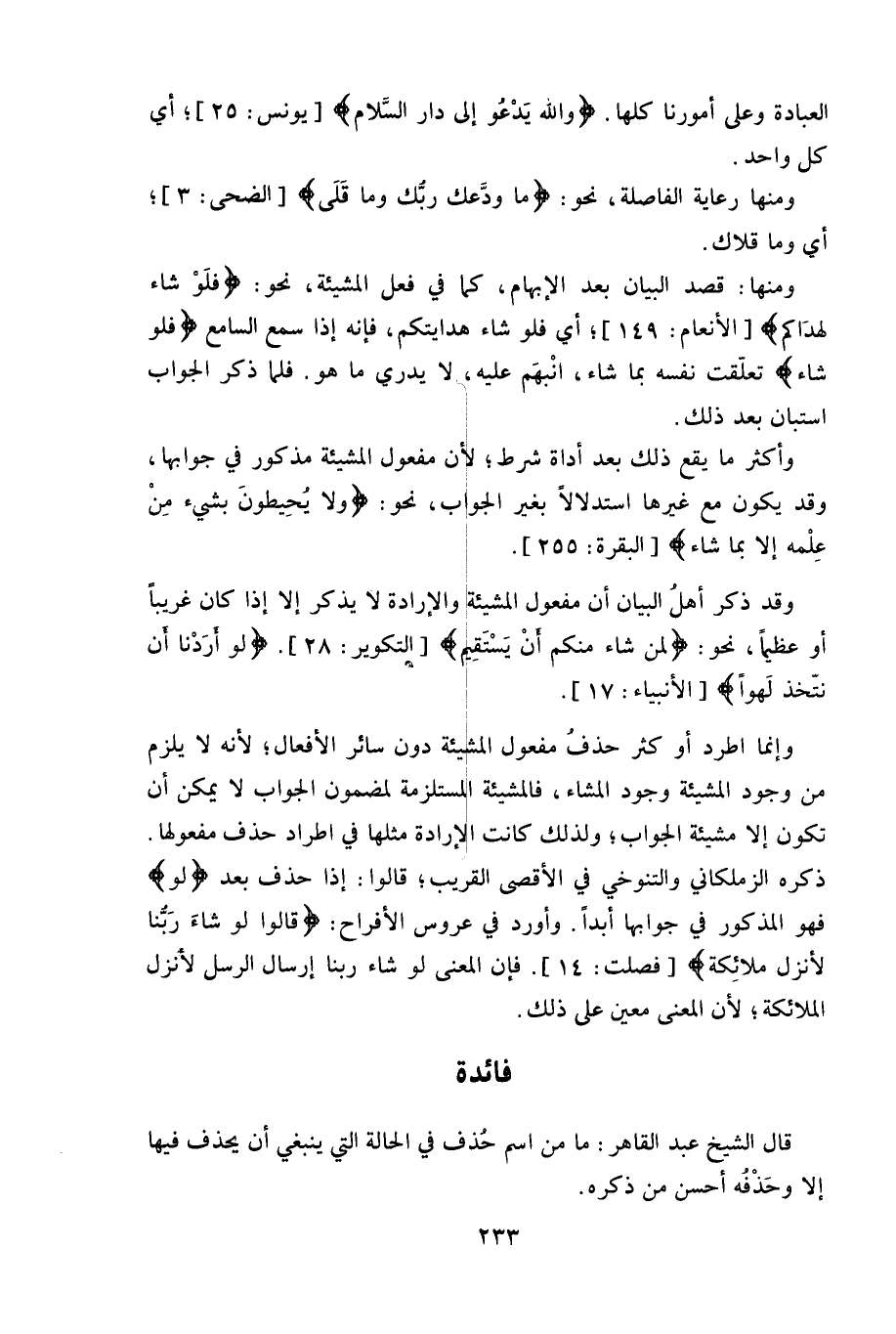 ومنها: قصد البيان بعد الإبهام، كما في فعل المشيئة، نحو: (فلَوْ شاء