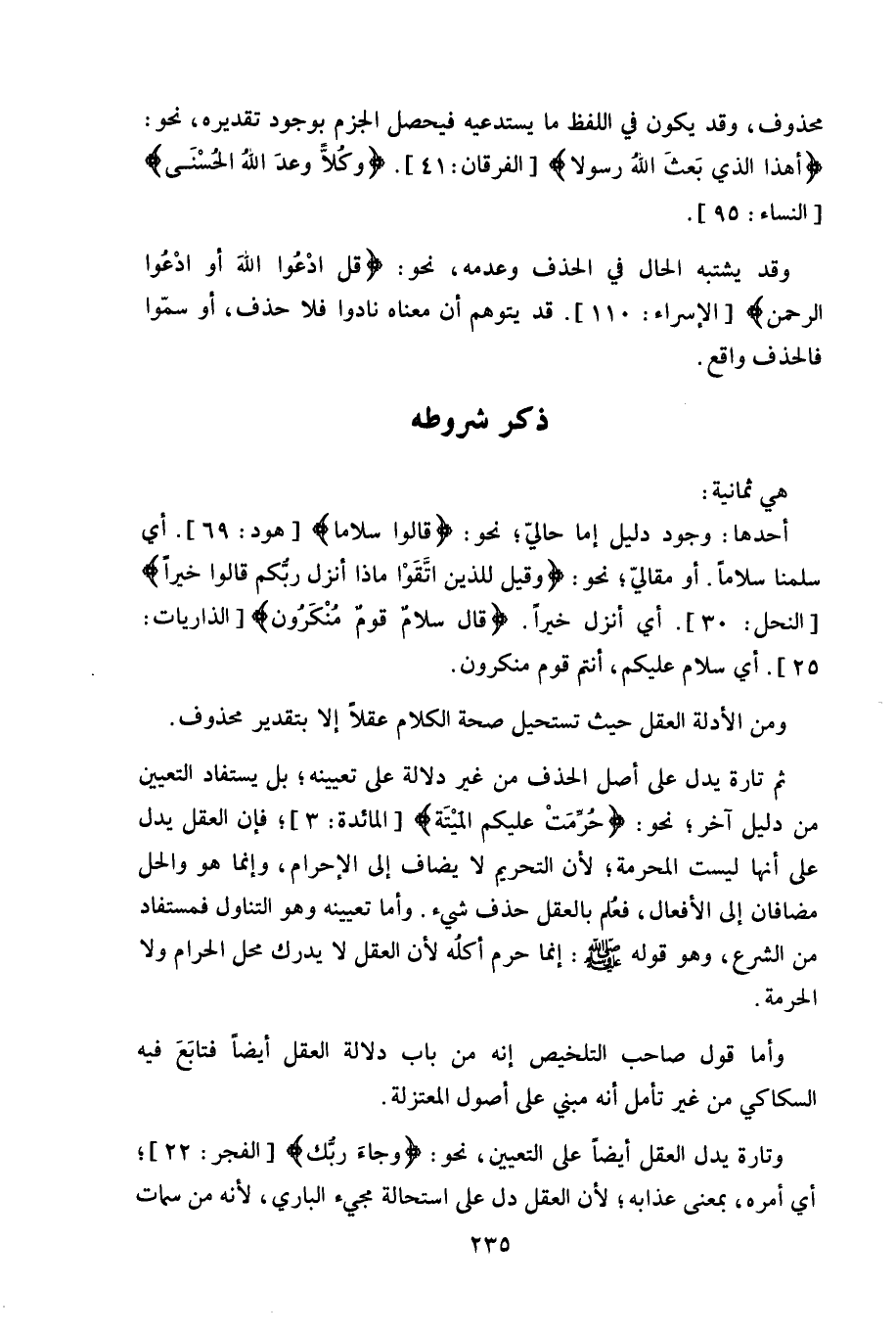 وتارة يدل العقل أيضاً على التعيين، نحو: (وجاءَ ربك) ، أي أمره، بمعنى عذابه، لأن العقل دل على استحالة مجيء الباري، لأنه من سمات