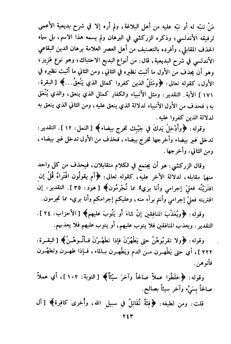 وقلَّ مَنْ تنبّه له أو نبّه عليه من أهل البلاغة، ولم أره إلا في شرح بديعية الأعمى لرفيقه الأندلسي، وذكره الزركشي في البرهان ولم يسمه هذا الاسم، بل سماه الحذف المقابلي، وأفرده بالتصنيف من أهل العصر العلامة برهان الدين البقاعي الأندلسي في شرح البديعية، قال: من أنواع البديع الاحتباك، وهو نوع عَزِيز، وهو أن يحذف من الأول ما أثبت نظيره في الثاني، ومن الثاني ما أثبت نظيره في الأول، كقوله تعالى: (ومَثَل الذين كفروا كمثل الذي يَنْعِقُ) .