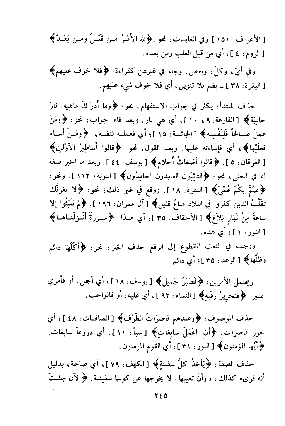 حذف المبتدأ: يكثر في جواب الاستفهام، نحو: (وَمَا أَدْرَاكَ مَا هِيَهْ (10) نَارٌ حَامِيَةٌ (11) . أي هي نار.
