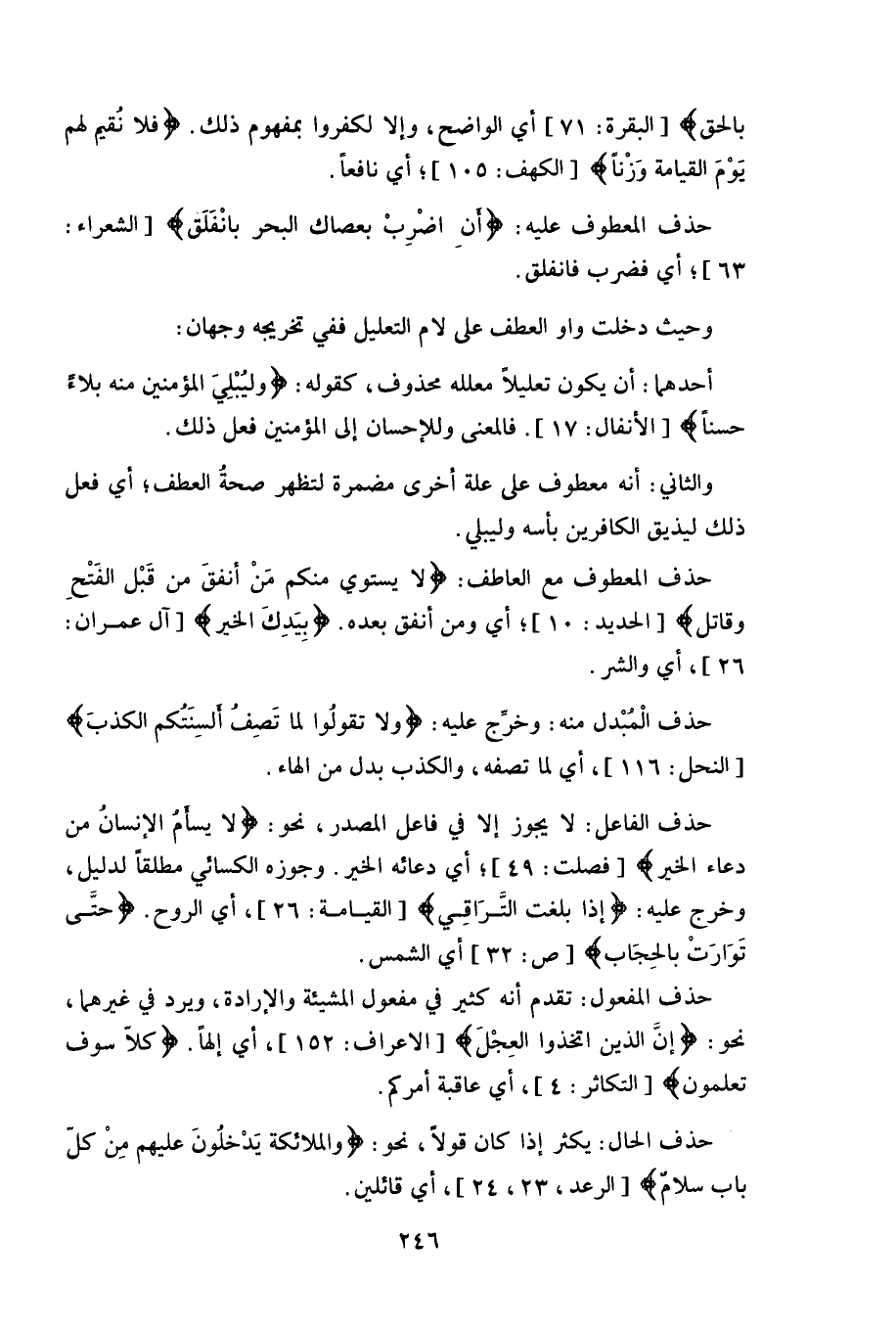 حذف الفاعل: لا يجوز إلا في فاعل المصدر، نحو: (لَا يَسْأَمُ الْإِنْسَانُ مِنْ دُعَاءِ الْخَيْرِ) ، أي دعائه الخير.