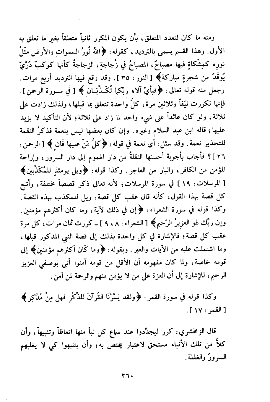 فإنها تكررت نيفاً وثلاثين مرة، كلُّ واحدة تتعلق بما قبلها، ولذلك زادت على ثلاثة، ولو كان عائداً على شيء واحد لما زاد على ثلاثة، لأن التأكيد لا يزيد عليها، قاله ابن عبد السلام وغيره.