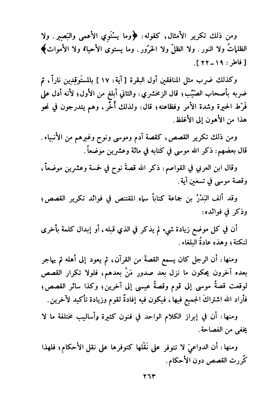 ومن ذلك تكرير الأمثال، كقوله: (وَمَا يَسْتَوِي الْأَعْمَى وَالْبَصِيرُ (19) وَلَا الظُّلُمَاتُ وَلَا النُّورُ (20) وَلَا الظِّلُّ وَلَا الْحَرُورُ (21) وَمَا يَسْتَوِي الْأَحْيَاءُ وَلَا الْأَمْوَاتُ.