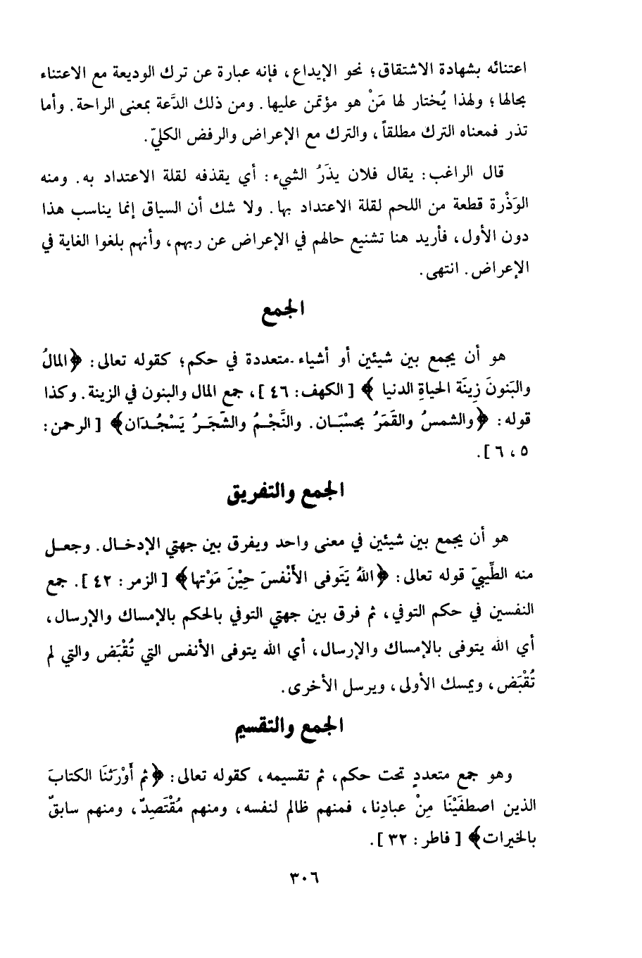 وهو جمع متعددٍ تحت حكم، ثم تقسيمه، كقوله تعالى: (ثُمَّ أَوْرَثْنَا الْكِتَابَ الَّذِينَ اصْطَفَيْنَا مِنْ عِبَادِنَا فَمِنْهُمْ ظَالِمٌ لِنَفْسِهِ وَمِنْهُمْ مُقْتَصِدٌ وَمِنْهُمْ سَابِقٌ بِالْخَيْرَاتِ بِإِذْنِ اللَّهِ) .