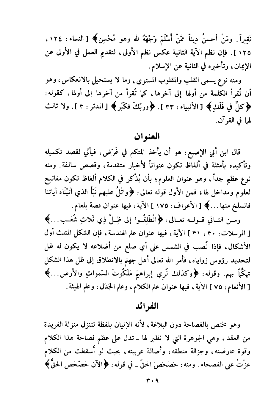 ومنه نوع عظيم جداً، وهو عنوان العلوم، بأن يُذْكر في الكلام ألفاظ تكون مفاتيح لعلوم ومداخل لها، فمن الأول قوله تعالى: (وَاتْلُ عَلَيْهِمْ نَبَأَ الَّذِي آتَيْنَاهُ آيَاتِنَا فَانْسَلَخَ مِنْهَا) .