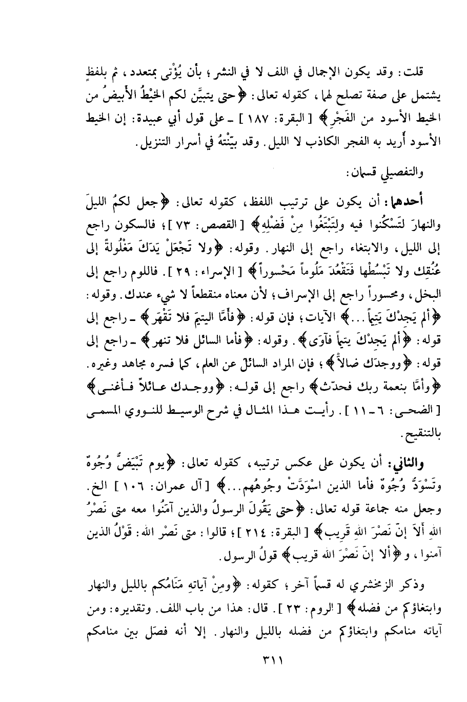 قلت: وقد يكون الإجمال في اللف لا في النشر، بأن يُؤْتى بمتعدد، ثم بلفظٍ