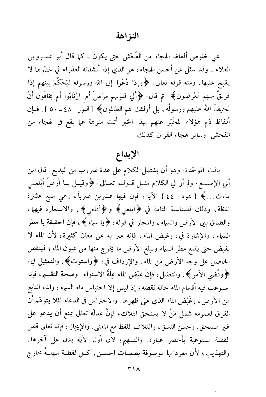 فإن فيها عشرين ضرباً، وهي سبع عشرة لفظة، وذلك للمناسبة التامة في (ابلعي) و (أقلعي) ، والاستعارة فيهما، والطباق بين الأرض والسماء، والمجاز في قوله: (يَا سَمَاءُ) ، فإن الحقيقة يا مطر السماء، والإشارة في: وغيض الماء، فإنه عبر به عن معان كثيرة، لأن الماء لا يغيض حتى يقلع مطر السماء وتبلع الأرض ما يخرج منها من عيون الماء، فينقص الحاصل على وَجْه الأرض من الماء.