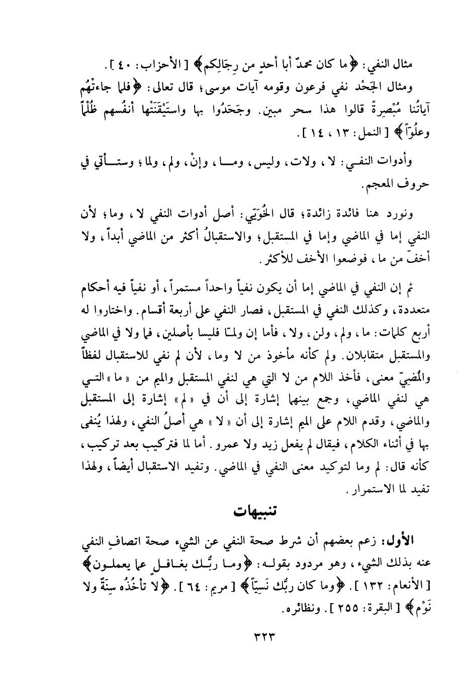 مثال النفي: (مَا كَانَ مُحَمَّدٌ أَبَا أَحَدٍ مِنْ رِجَالِكُمْ) .
