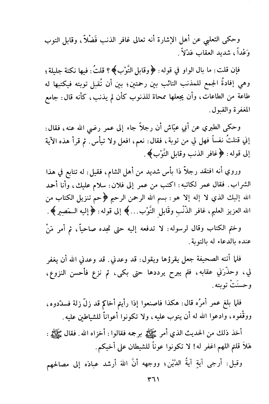 وحكى الثعلي عن أهل الإشارة أنه تعالى غافر الذنب فَضْلاً، وقابل التوب