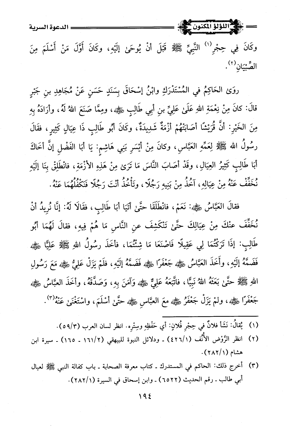 (¬1) قلتُ: ممَّا يدلُّ على أن الدَّعوة أول ما بدأت كانت سِرِّية، ما رواه الإمام مسلم في صحيحه - رقم الحديث (832) عن عمرو بن عَبَسَة -رضي اللَّه عنه- قال: . . . سمعتُ بِرَجُلٍ بمكَّة يخبرُ أخبارًا، فقعَدْتُ على راحِلَتِي، فقدمتُ عليه، فإذا رسول اللَّه -صلى اللَّه عليه وسلم- مُسْتَخْفِيًا. . .
