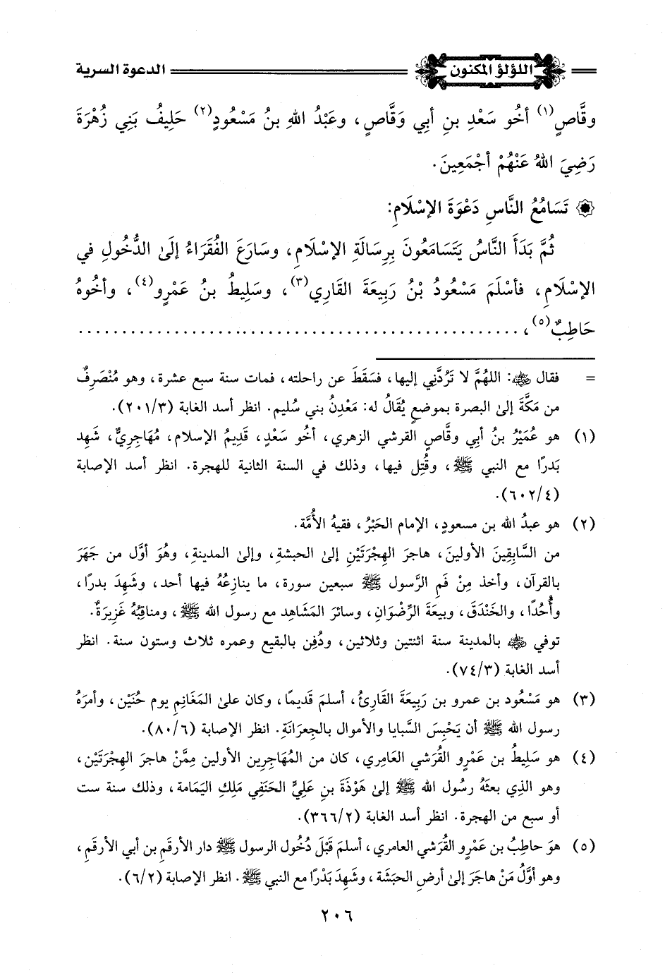 (¬5) هو سَعِيدُ بنُ زَيْدِ بن عَمْرِو بن نُفَيْلٍ القُرَشِيُّ العَدَوِيُّ، أحدُ العَشَرَةِ المَشْهُودِ لهم بالجنة، وهو ابنُ عَمِّ عُمَرَ بن الخَطاب -رضي اللَّه عنه-، وكان صِهْرَ عُمَرَ زَوْجَ أختِهِ فاطِمَةَ بنتِ الخطاب.