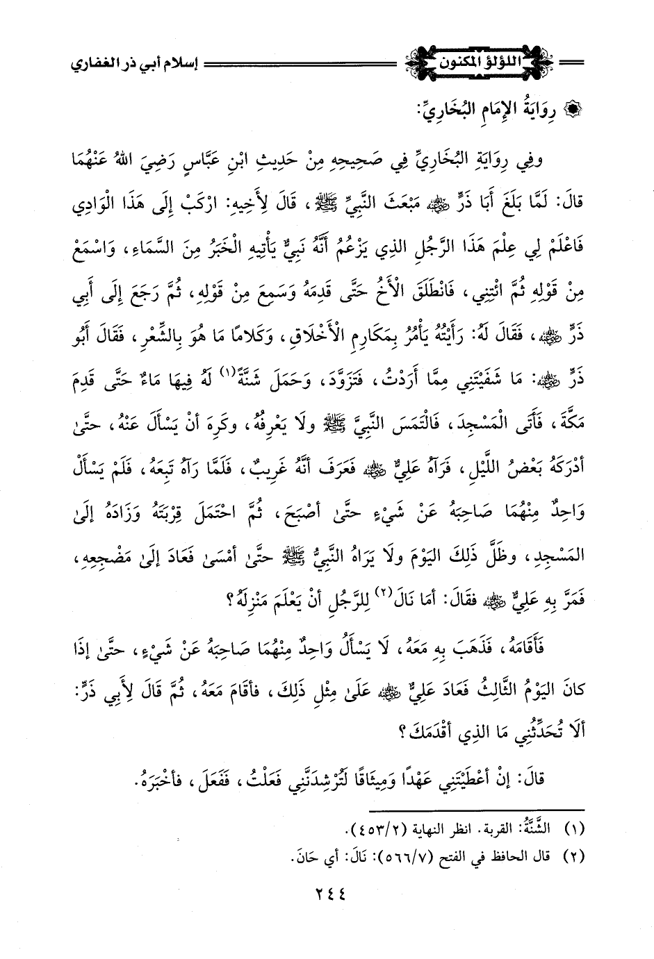 قال أَبُو ذَرٍّ -رضي اللَّه عنه-: فَجَاءَ رَسُولُ اللَّه -صلى اللَّه عليه وسلم- هُوَ وصَاحِبُهُ حتَّى اسْتَلَمَ الحَجَرَ، فَطَافَ بِالْبَيْتِ، ثُمَّ صَلَّى، فلَمَّا قَضَى صَلَاتَهُ أتَيْتُهُ، فكنْتُ أوَّلَ مَنْ حَيَّاهُ بِتَحِيَّةِ الإِسْلَامِ، فَقُلْتُ: السَّلَامُ عَلَيْكَ يا رَسُولَ اللَّهِ.