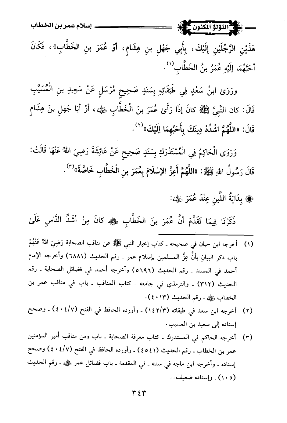 رَوَى الإِمامُ أَحْمَدُ في مُسْنَدِهِ، وابْنُ حِبَّانَ في صَحِيحِهِ بِسَنَدٍ حَسَنٍ عَنِ ابْنِ عُمَرَ رَضِيَ اللَّهُ عَنْهُما قَالَ: قَالَ رَسُولُ اللَّهِ -صلى اللَّه عليه وسلم-: "اللَّهُمَّ أَعِزَّ الْإِسْلامَ بِأَحَبِّ