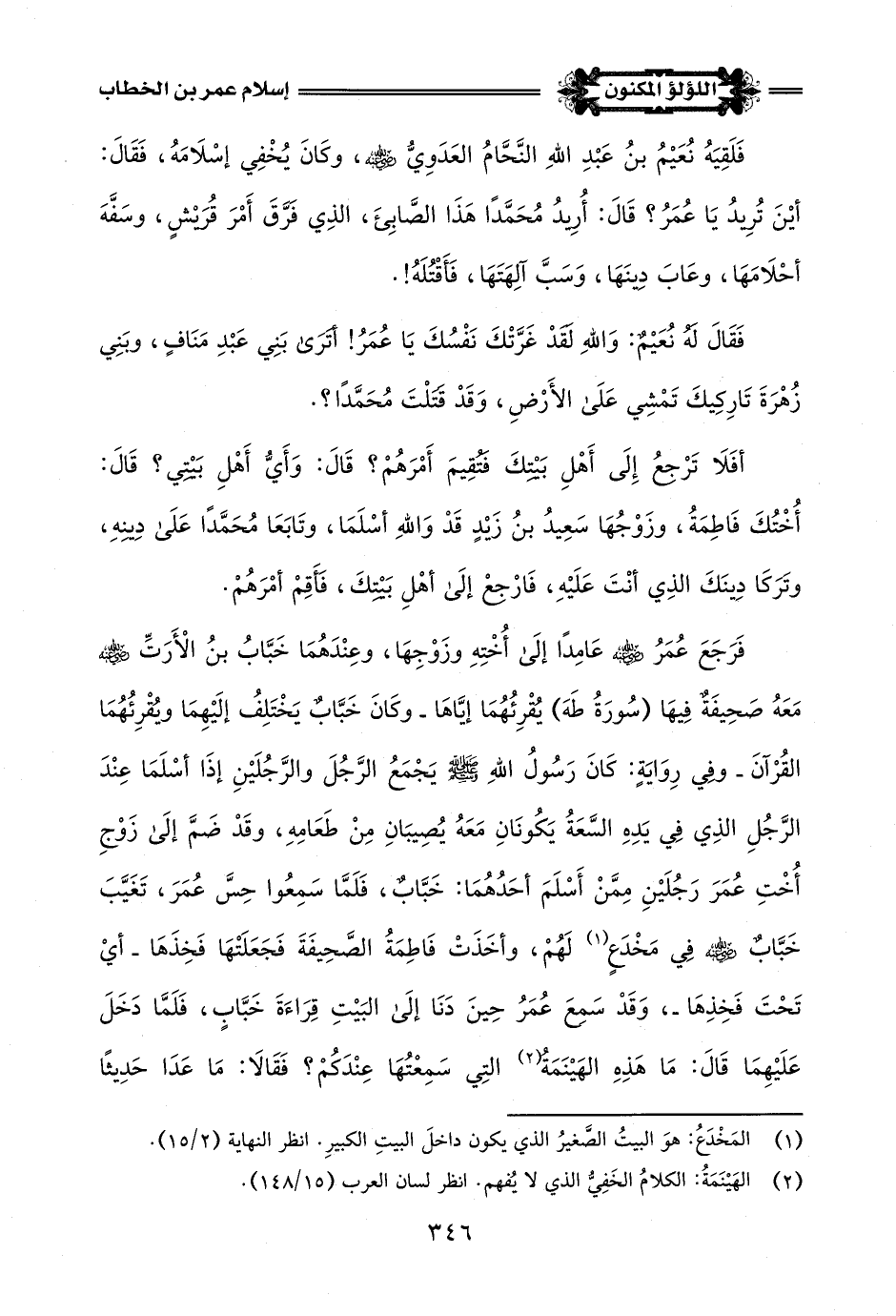 وَكَانَتْ فاطِمَةُ بِنْتُ الخَطَّابِ رَضِيَ اللَّه عَنْهَا قَدْ سَبَقَتْهُ إِلَى الْإِسْلَامِ هِيَ وَزَوْجُها سَعِيدُ بنُ زَيْدٍ وَهُوَ أحَدُ العَشَرَةِ المبشَّرِينَ بِالْجَنَّةِ، وهُوَ ابْنُ عَمِّهَا، وكانَا يُخْفِيانِ إسْلامَهُمَا، وَكانَ خَبَّابُ بنُ الْأَرَتِّ -رضي اللَّه عنه- مِنْ قُدَماءَ المُسْلِمِينَ يَخْتَلِفُ إِلَى فاطِمَةَ وزَوْجِها يُقْرِئُها القُرْآنَ (¬1).