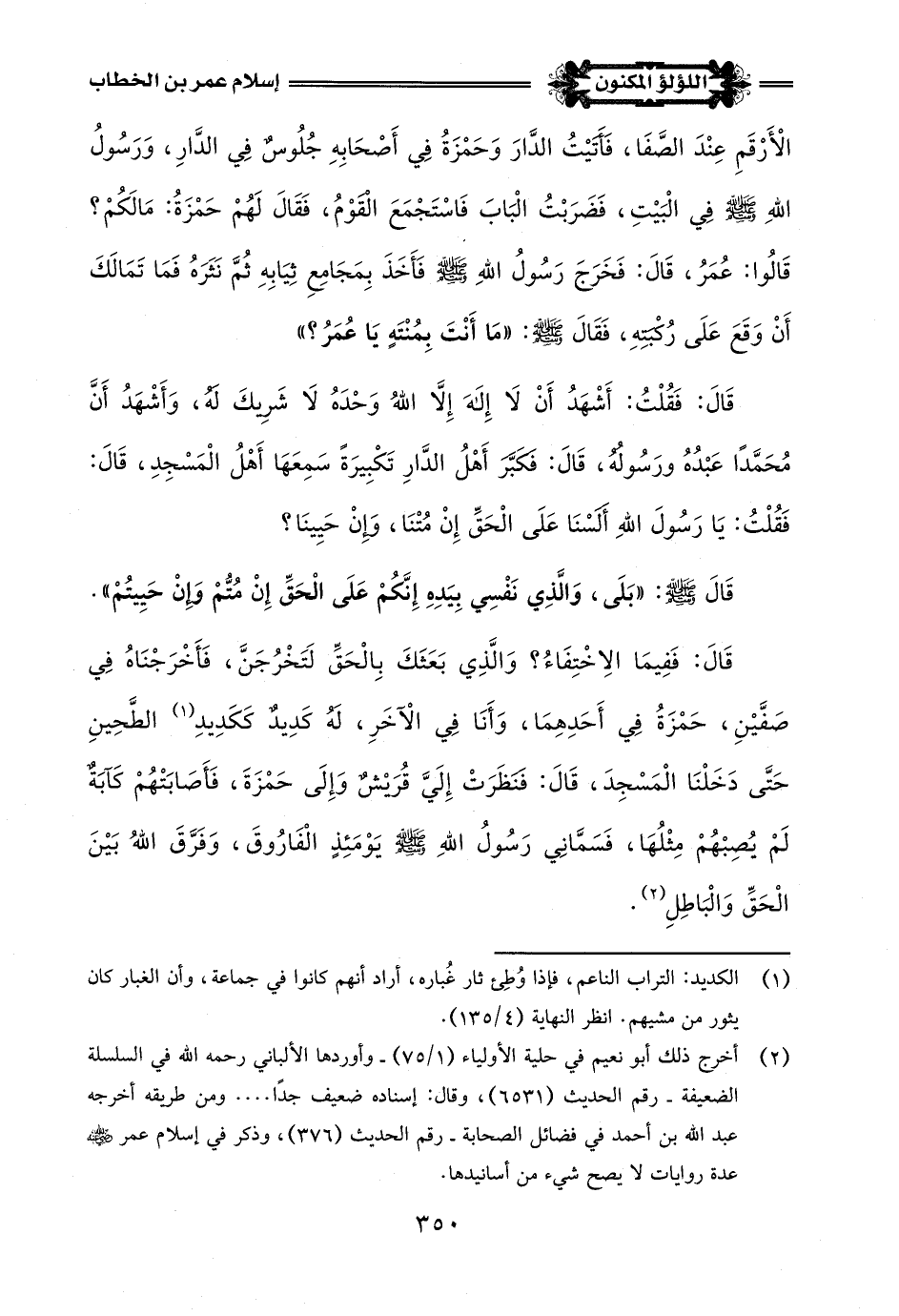 (¬1) أخرج قِصةَ إسلام عمر -رضي اللَّه عنه-: الإمام أحمدُ في فضائل الصحابة - رقم الحديث (376) - والحاكم في المستدرك - كتاب معرفة الصحابة - باب استقامة فاطمة على الإِسلام - رقم الحديث (6981) - وابن سعد في طبقاته (3/ 142) - وسندها ضعيف - وأخرجها ابن إسحاق في السيرة (1/ 381) بدون سند.