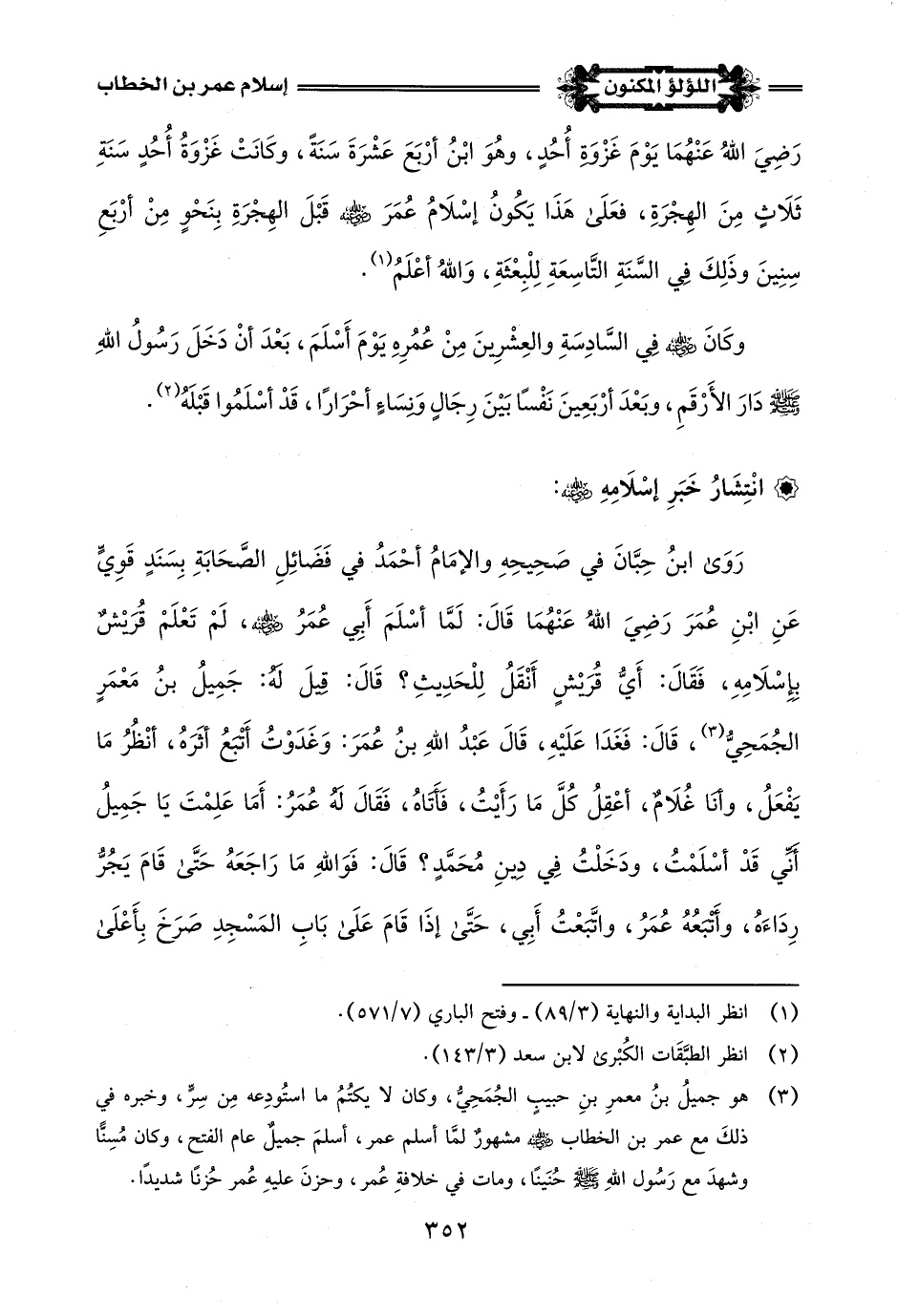 رَوَى ابنُ حِبَّانَ فِي صَحِيحِهِ والإِمَامُ أَحْمَدُ فِي فَضَائِلِ الصَّحَابَةِ بِسَنَدٍ قَوِيٍّ عَنِ ابْنِ عُمَرَ رَضِيَ اللَّهُ عَنْهُمَا قَالَ: لَمَّا أَسْلَمَ أَبِي عُمَرُ -رضي اللَّه عنه-، لَمْ تَعْلَمْ قُرَيْشٌ بِإِسْلَامِهِ، فَقَالَ: أَيُّ قُرَيْشٍ أَنْقَلُ لِلْحَدِيثِ؟ قَالَ: قِيلَ لَهُ: جَمِيلُ بنُ مَعْمَرٍ الجُمَحِيُّ (¬1)، قَالَ: فَغَدَا عَلَيْهِ، قَالَ عَبْدُ اللَّهِ بنُ عُمَرَ: وَغَدَوْتُ أَتْبَعُ أَثَرَهُ، أنْظُرُ مَا يَفْعَلُ، وأَنَا غُلَامٌ، أعْقِلُ كُلَّ مَا رَأَيْتُ، فَأَتَاهُ، فَقَالَ لَهُ عُمَرُ: أَمَا عَلِمْتَ يَا جَمِيلُ أَنِّي قدْ أسْلَمْتُ، ودَخَلْتُ فِي دِينِ مُحَمَّدٍ؟ قَال: فَوَاللَّهِ مَا رَاجَعَهُ حَتَّى قَامَ يَجُرُّ رِدَاءَهُ، وأَتْبَعُهُ عُمَرُ، واتَّبَعْتُ أَبِي، حَتَّى إِذَا قَامَ عَلَى بَابِ المَسْجِدِ صَرَخَ بِأَعْلَى صَوْتِهِ: يَا مَعْشَرَ قُرَيْشٍ! -وَهُمْ فِي أنْدِيَتِهِمْ حَوْلَ الكَعْبَةِ-، ألَا إِنَّ عُمَرَ بنَ الخَطَّابِ قَدْ صَبَأَ، قَالَ: فَقَالَ عُمَرُ مِنْ خَلْفِهِ: كَذَبَ، ولَكِنِّي قَدْ أسْلَمْتُ أَشْهَدُ أَنْ لَا إِلَهَ إِلَّا اللَّهُ، وَأَنَّ مُحَمَّدًا عَبْدُهُ وَرَسُولُهُ، فَثَارُوا إِلَيْهِ، فَمَا بَرِحَ يُقَاتِلُهُمْ ويُقَاتِلُونَهُ حَتَّى قَامَتِ الشَّمْسُ عَلَى رُؤُوسِهِمْ، ونَالَ مِنْهُ الْإِعْيَاءُ (¬2) فَقَعَدَ.