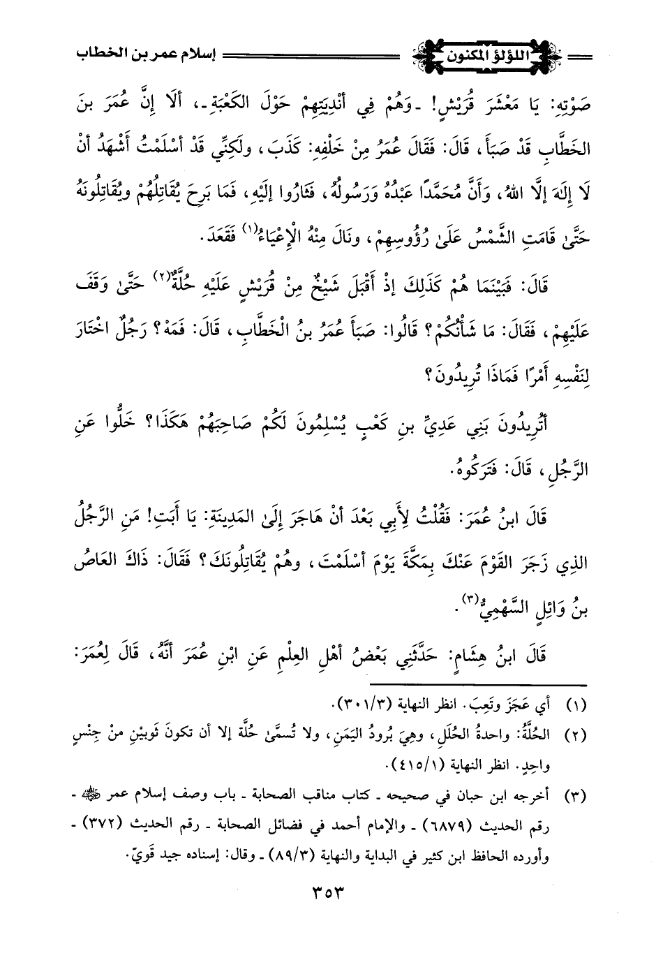 (¬1) أخرجه ابن حبان في صحيحه - كتاب مناقب الصحابة - باب وصف إسلام عمر -رضي اللَّه عنه- رقم الحديث (6879) - والإمام أحمد في فضائل الصحابة - رقم الحديث (372) - وأورده الحافظ ابن كثير في البداية والنهاية (3/ 89) - وقال: إسناده جيد قَويّ.