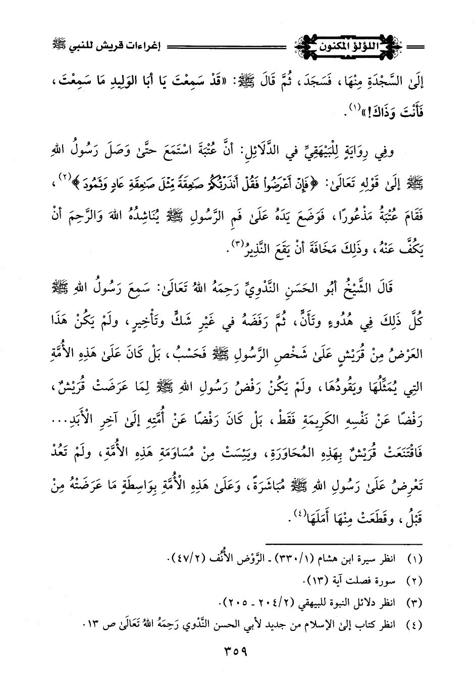 قَالَ الشَّيْخُ أَبُو الحَسَنِ النَّدْوِيِّ رَحِمَهُ اللَّهُ تَعَالَى: سَمِعَ رَسُولُ اللَّهِ -صلى اللَّه عليه وسلم- كُلَّ ذَلِكَ فِي هُدُوءٍ وتَأَنٍّ، ثُمَّ رَفَضَهُ فِي غَيْرِ شَكٍّ وتَأْخِيرٍ، وَلَمْ يَكُنْ هَذَا العَرْضُ مِنْ قُرَيْشٍ عَلَى شَخْصِ الرَّسُولِ -صلى اللَّه عليه وسلم- فَحَسْبُ، بَلْ كَانَ عَلَى هَذِهِ الأُمَّةِ التِي يُمَثِّلُهَا ويَقُودُهَا، وَلَمْ يَكُنْ رَفْضُ رَسُولِ اللَّهِ -صلى اللَّه عليه وسلم- لِمَا عَرَضَتْ قُرَيْشٌ، رَفْضًا عَنْ نَفْسِهِ الكَرِيمَةِ فَقَطْ، بَلْ كَانَ رَفْضًا عَنْ أُمَّتِهِ إِلَى آخِرِ الْأَبَدِ. . . فَاقْتَنَعَتْ قُرَيْشٌ بِهَذِهِ المُحَاوَرَةِ، ويَئِسَتْ مِنْ مُسَاوَمَةِ هَذِهِ الأُمَّةِ، وَلَمْ تَعُدْ تَعْرِضُ عَلَى رَسُولِ اللَّهِ -صلى اللَّه عليه وسلم- مُباشَرَةً، وَعَلَى هَذِهِ الْأُمَّةِ بِوَاسِطَةٍ مَا عَرَضَتْهُ مِنْ قَبْلُ، وقَطَعَتْ مِنْهَا أَمَلَهَا (¬4).