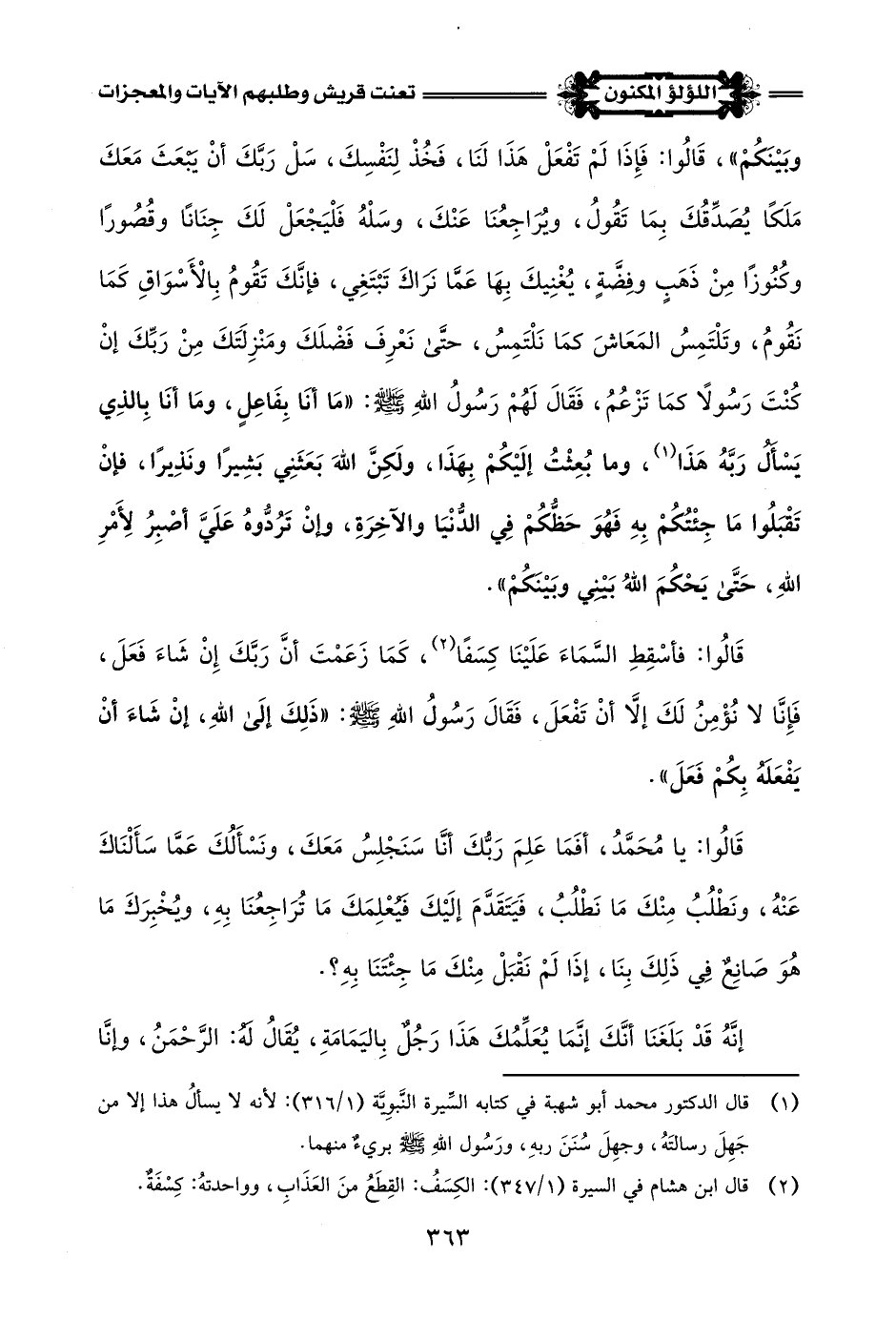 (¬1) قال الدكتور محمد أبو شهبة في كتابه السِّيرة النَّبوِيَّة (1/ 316): لأنه لا يسألُ هذا إلا من جَهِلَ رسالتَهُ، وجهِلَ سُنَنَ ربهِ، ورَسُول اللَّهِ -صلى اللَّه عليه وسلم- بريءٌ منهما.