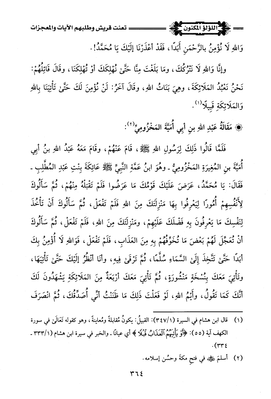 فَلَمَّا قَالُوا ذَلِكَ لِرَسُولِ اللَّهِ -صلى اللَّه عليه وسلم-، قَامَ عَنْهُمْ، وقَامَ مَعَهُ عَبْدُ اللَّهِ بنُ أَبِي أُمَيَّةَ بنِ المُغِيرَةِ المَخْزُومِيُّ -وهُوَ ابنُ عَمَّةِ النَّبِيِّ -صلى اللَّه عليه وسلم- عَاتِكَةَ بِنْتِ عَبْدِ المُطَّلِبِ- فَقَالَ: يَا مُحَمَّدُ، عَرَضَ عَلَيْكَ قَوْمُكَ مَا عَرَضُوا فَلَمْ تَقْبَلْهُ مِنْهُمْ، ثُمَّ سَأَلُوكَ لِأَنْفُسِهِمْ أُمُورًا لِيَعْرِفُوا بِهَا مَنْزِلَتَكَ مِنَ اللَّهِ فَلَمْ تَفْعَلْ، ثُمَّ سَأَلُوكَ أَنْ تَأْخُذَ لِنَفْسِكَ مَا يَعْرِفُونَ بِهِ فَضْلَكَ عَلَيْهِمْ، ومَنْزِلَتَكَ مِنَ اللَّهِ، فَلَمْ تَفْعَلْ، ثُمَّ سَأَلُوكَ أَنْ تُعَجِّلَ لَهُمْ بَعْضَ مَا تُخَوِّفُهُمْ بِهِ مِنَ العَذَابِ، فَلَمْ تَفْعَلْ، فَوَاللَّهِ لَا أُؤْمِنُ بِكَ أبَدًا حَتَّى تَتَّخِذَ إلى السَّمَاءِ سُلَّمًا، ثُمَّ تَرْقَى فِيهِ، وَأَنَا أنْظُرُ إِلَيْكَ حَتَّى تَأْتِيَهَا، وتَأْتِيَ مَعَكَ بِنُسْخَةٍ مَنْشُورَةٍ، ثُمَّ تَأْتِيَ مَعَكَ أرْبَعَةٌ مِنَ المَلَائِكَةِ يَشْهَدُونَ لَكَ أَنَّكَ كَمَا تَقُولُ، وأَيْمُ اللَّهِ، لَوْ فَعَلْتَ ذَلِكَ مَا ظَنَنْتُ أنِّي أُصَدِّقُكَ، ثُمَّ انْصَرَفَ