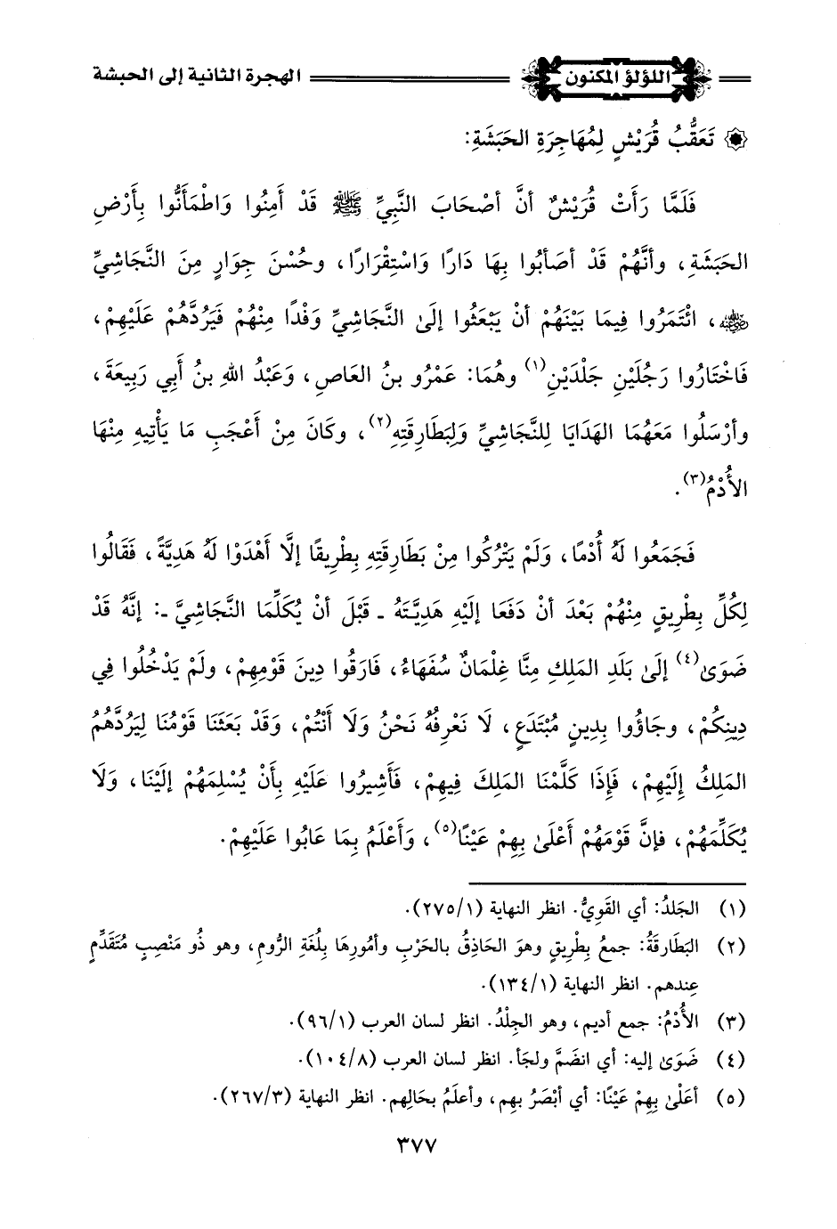 فَلَمَّا رَأَتْ قُرَيْشٌ أَنَّ أصْحَابَ النَّبِيِّ -صلى اللَّه عليه وسلم- قدْ أَمِنُوا وَاطْمَأَنُّوا بِأَرْضِ الحَبَشَةِ، وأنَّهُمْ قَدْ أصَأبُوا بِهَا دَارًا وَاسْتِقْرَارًا، وحُسْنَ جِوَارٍ مِنَ النَّجَاشِيِّ -رضي اللَّه عنه-، ائْتَمَرُوا فِيمَا بَيْنَهُمْ أَنْ يَبْعَثُوا إِلَى النَّجَاشِيِّ وَفْدًا مِنْهُمْ فَيَرُدَّهُمْ عَلَيْهِمْ، فَاخْتَارُوا رَجُلَيْنِ جَلْدَيْنِ (¬1) وهُمَا: عَمْرُو بنُ العَاصِ، وَعَبْدُ اللَّهِ بنُ أَبِي رَبِيعَةَ، وأرْسَلُوا مَعَهُمَا الهَدَايَا لِلنَّجَاشِيِّ وَلبَطَارِقَتِهِ (¬2)، وكَانَ مِنْ أَعْجَبِ مَا يَأْتيهِ مِنْهَا الأُدْمُ (¬3).