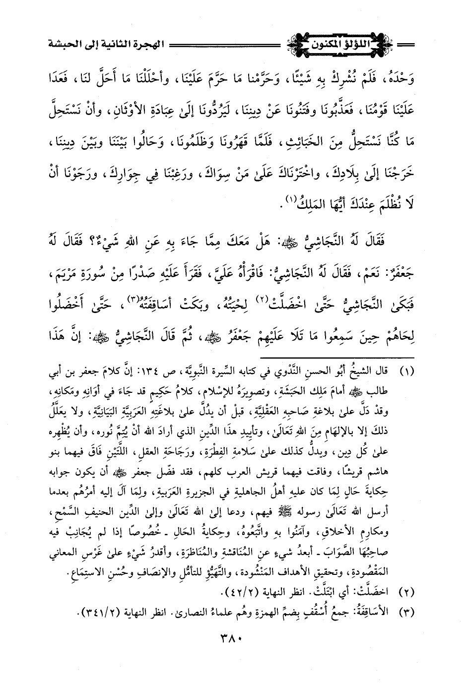(¬1) قال الشيخُ أَبُو الحسنِ النَّدْوي فِي كتابه السِّيرة النَّبوِيَّة، ص 134: إِنَّ كلامَ جعفر بن أبي طالب -رضي اللَّه عنه- أمامَ مَلِك الحَبَشَةِ، وتصوِيرَهُ للإسْلام، كلامُ حَكِيمٍ قد جَاءَ فِي أوَانِهِ ومَكانِهِ، وقدْ دَلَّ على بلاغةِ صَاحبِهِ العَقْلِيَّةِ، قبلْ أن يدُلَّ على بلاغَتِهِ العَرَبِيَّةِ البَيَانِيَّةِ، ولا يعَلَّلُ ذلكَ إِلَّا بالإلهَامِ مِنَ اللَّهِ تَعَالَى، وتأيِيدِ هذَا الدِّينِ الذي أَرادَ اللَّه أَنْ يُتِمَّ نُوره، وأن يُظْهِره على كُل دِين، ويدلُّ كذلك على سَلامةِ الفِطْرَةِ، ورَجَاحَةِ العقلِ، اللَّتَيْنِ فَاقَ فيهما بنو هاشم قريشًا، وفاقت فيهما قريش العرب كلهم، فقد فضّل جعفر -رضي اللَّه عنه- أن يكون جوابه حِكايةَ حَالٍ لِمَا كان عليهِ أهلُ الجاهليةِ فِي الجزيرةِ العَرَبيةِ، ولمَا آلَ إليه أمرُهُم بعدما أرسل اللَّه تَعَالَى رسوله -صلى اللَّه عليه وسلم- فيهم، ودعا إلى اللَّه تَعَالَى وإلى الدِّين الحنيفِ السَّمْحِ، ومكارِمِ الأخلاقِ، وآمَنُوا بهِ واتَّبَعُوهُ، وحِكايةُ الحَالِ -خُصُوصًا إذا لم يُجَانِبْ فيه صاحِبُهَا الصَّوَابَ- أبعدُ شيءٍ عنِ المُنَاقشةِ والمُنَاظرَةِ، وأقدرُ شَيْءٍ على غَرْسِ المعاني المَقْصُودةِ، وتحقيقِ الأهداف المَنْشُودة، والتَّهَيُّؤِ للتأمُّلِ والإنصَافِ وحُسْنِ الاستِمَاعِ.
