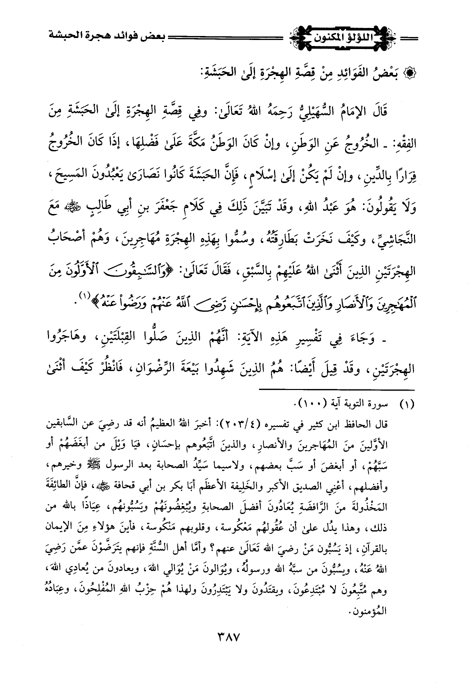 قَالَ الإِمَامُ السُّهَيْلِيُّ رَحِمَهُ اللَّهُ تَعَالَى: وفِي قِصَّةِ الهِجْرَةِ إِلَى الحبَشَةِ مِنَ الفِقْهِ: - الخُرُوجُ عَنِ الوَطَنِ، وَإِنْ كَانَ الوَطَنُ مَكَّةَ عَلَى فَضْلِهَا، إِذَا كَانَ الخُرُوجُ فِرَارًا بِالدِّينِ، وَإِنْ لَمْ يَكُنْ إِلَى إسْلَامٍ، فَإِنَّ الحَبَشَةَ كَانُوا نَصَارَى يَعْبُدُونَ المَسِيحَ، وَلَا يَقُولُونَ: هُوَ عَبْدُ اللَّهِ، وَقَدْ تَبَيَّنَ ذَلِكَ فِي كَلَامِ جَعْفَرَ بنِ أَبِي طَالِبٍ -رضي اللَّه عنه- مَعَ النَّجَاشِيِّ، وكَيْفَ نَخَرَتْ بَطَارِقَتُهُ، وسُمُّوا بِهَذ الهِجْرَةِ مُهَاجِرِينَ، وَهُمْ أصْحَابُ الهِجْرَتَيْنِ الذِينَ أَثْنَى اللَّهُ عَلَيْهِمْ بِالسَّبْقِ، فَقَالَ تَعَالَى: {وَالسَّابِقُونَ الْأَوَّلُونَ مِنَ الْمُهَاجِرِينَ وَالْأَنْصَارِ وَالَّذِينَ اتَّبَعُوهُمْ بِإِحْسَانٍ رَضِيَ اللَّهُ عَنْهُمْ وَرَضُوا عَنْهُ} (¬1).