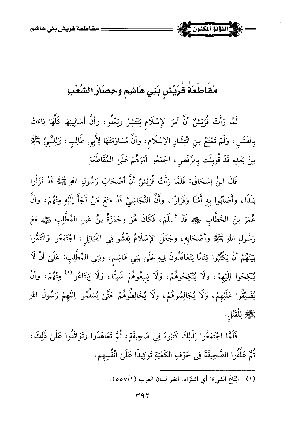 قَالَ ابنُ إسْحَاقَ: فَلَمَّا رَأَتْ قُرَيْشٌ أَنَّ أصْحَابَ رَسُولِ اللَّهِ -صلى اللَّه عليه وسلم- قَدْ نَزَلُوا بَلَدًا، وأَصَأبُوا بِهِ أَمْنًا وَقَرَارًا، وأَنَّ النَّجَاشِيَّ قَدْ مَنَعَ مَنْ لَجَأَ إِلَيْهِ مِنْهُمْ، وَأَنَّ عُمَرَ بنَ الخَطَّابِ -رضي اللَّه عنه- قَدْ أَسْلَمَ، فكَانَ هُوَ وحَمْزَةُ بنُ عَبْدِ المُطَّلِبِ -رضي اللَّه عنه- مَعَ رَسُولِ اللَّهِ -صلى اللَّه عليه وسلم- وأصْحَابِهِ، وجَعَلَ الإِسْلَامُ يَفْشُو في القَبَائِلِ، اجْتَمَعُوا وَائْتَمُّوا بَيْنَهُمْ أَنْ يَكْتبوا كِتَابًا يَتَعَاقَدُونَ فِيهِ عَلَى بَنِي هَاشِمٍ، وبَنِي المُطَّلِبِ: عَلَى أَنْ لَا يُنْكِحُوا إِلَيْهِمْ، ولَا يُنْكِحُوهُمْ، وَلَا يَبِيعُوهُمْ شَيئًا، وَلَا يَبْتَاعُوا (¬1) مِنْهُمْ، وَأَنْ يُضَيِّقُوا عَلَيْهِمْ، وَلَا يُجَالِسُوهُمْ، ولَا يُخَالِطُوهُمْ حَتَّى يُسَلِّمُوا إِلَيْهِمْ رَسُولَ اللَّهِ -صلى اللَّه عليه وسلم- لِلْقَتْلِ.