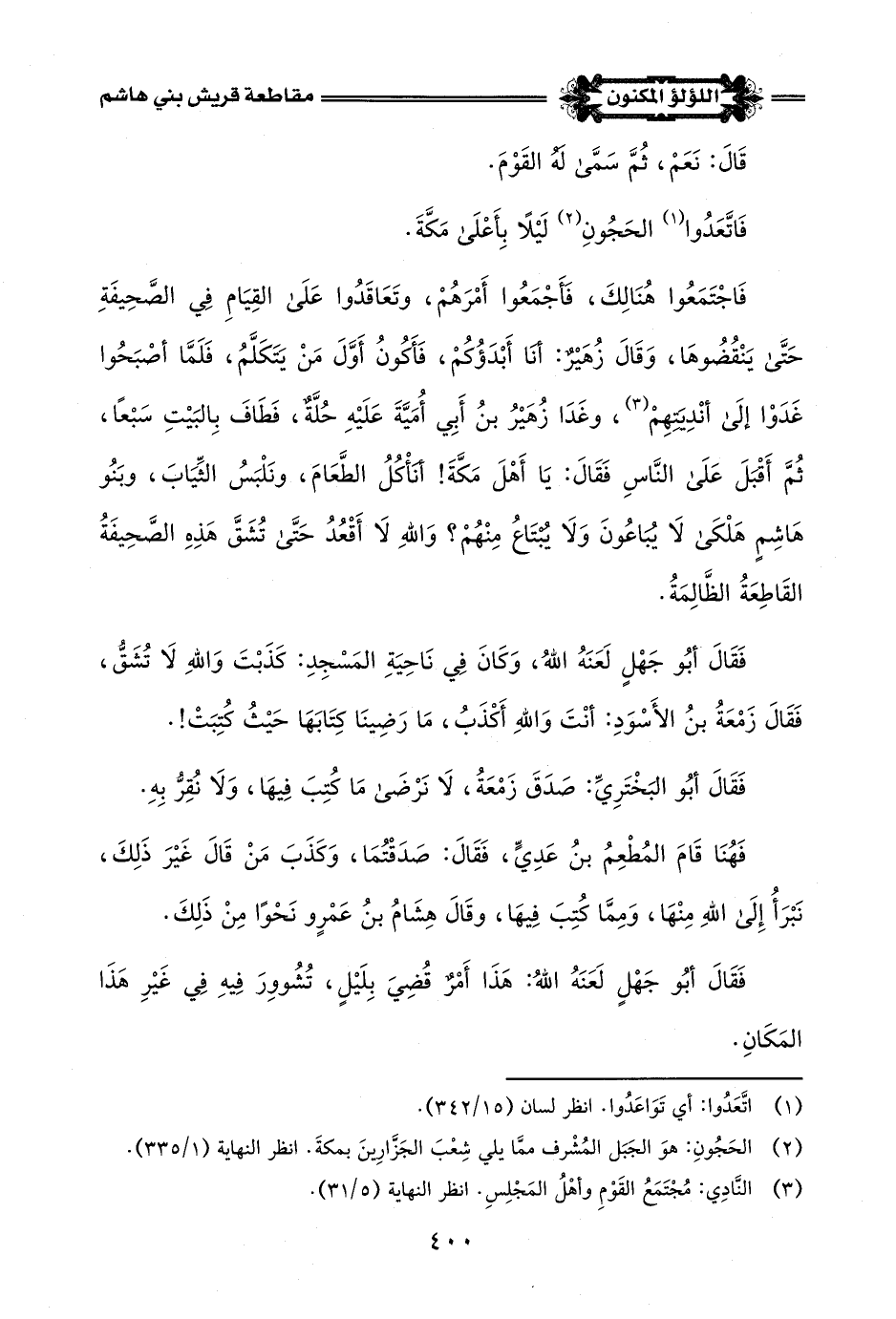 فَاجْتَمَعُوا هُنَالِكَ، فَأَجْمَعُوا أَمْرَهُمْ، وتَعَاقَدُوا عَلَى القِيَامِ فِي الصَّحِيفَةِ حَتَّى يَنْقُضُوهَا، وَقَالَ زُهَيْرٌ: أنَا أَبْدَؤُكُمْ، فَأَكُونُ أَوَّلَ مَنْ يَتَكَلَّمُ، فَلَمَّا أصْبَحُوا غَدَوْا إِلَى أنْدِيَتِهِمْ (¬3)، وغَدَا زُهَيْرٌ بنُ أَبِي أُمَيَّةَ عَلَيْهِ حُلَّةٌ، فَطَافَ بِالبَيْتِ سَبْعًا، ثُمَّ أَقْبَلَ عَلَى النَّاسِ فَقَالَ: يَا أَهْلَ مَكَّةَ! أنَأْكُلُ الطَّعَامَ، ونَلْبَسُ الثِّيَابَ، وبَنُو هَاشِمٍ هَلْكَى لَا يُبَاعُونَ وَلَا يُبْتَاعُ مِنْهُمْ؟ وَاللَّهِ لَا أَقْعُدُ حَتَّى تُشَقَّ هَذِهِ الصَّحِيفَةُ القَاطِعَةُ الظَّالِمَةُ.