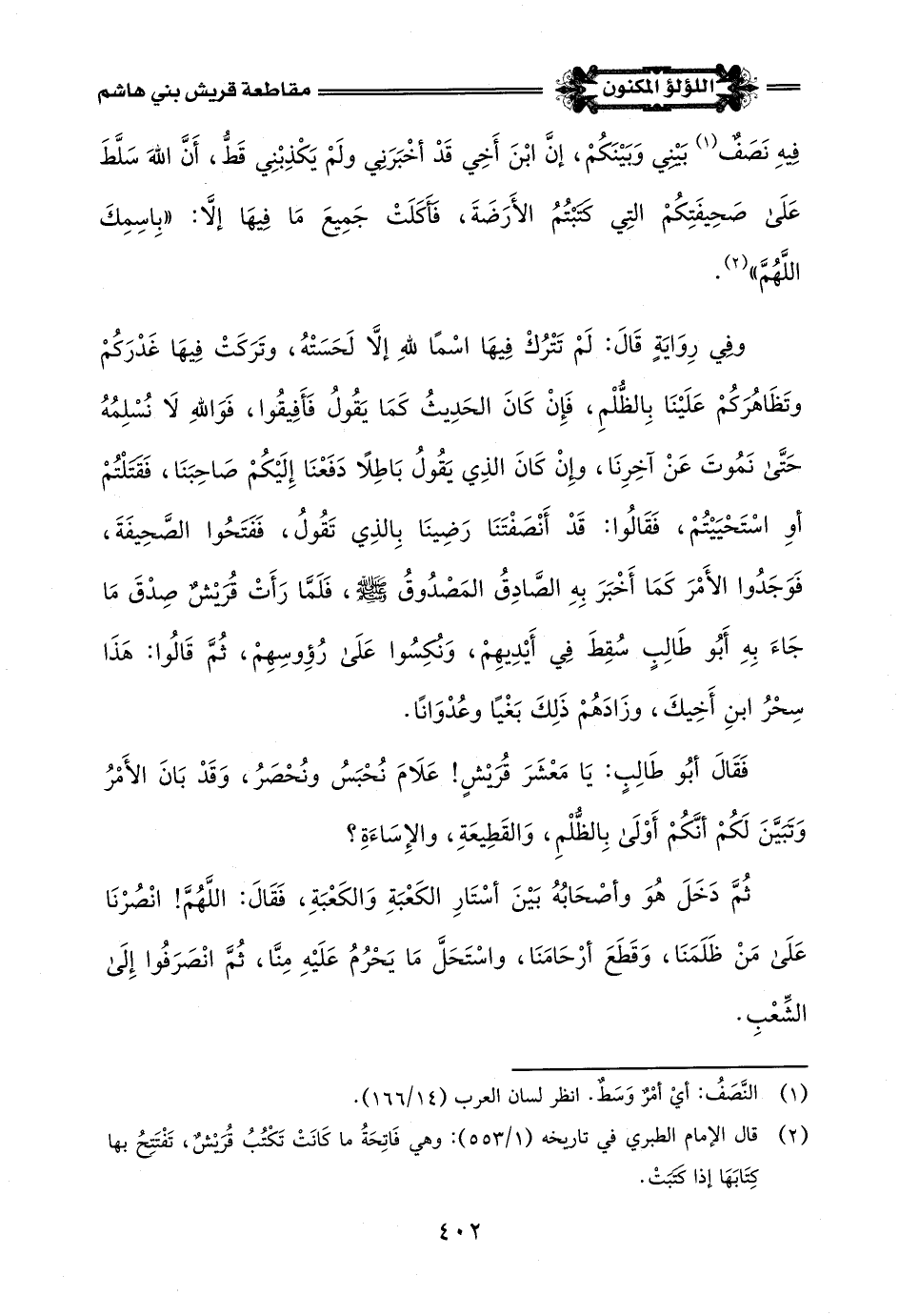 فَقَالَ أَبُو طَالِبٍ: يَا مَعْشَرَ قُرَيْشٍ! عَلَامَ نُحْبَسُ ونُحْصَرُ، وَقَدْ بَانَ الأَمْرُ وَتَبَيَّنَ لَكُمْ أنَكُمْ أَوْلَى بِالظُّلْمِ، وَالقَطِيعَةِ، والإِسَاءَةِ؟