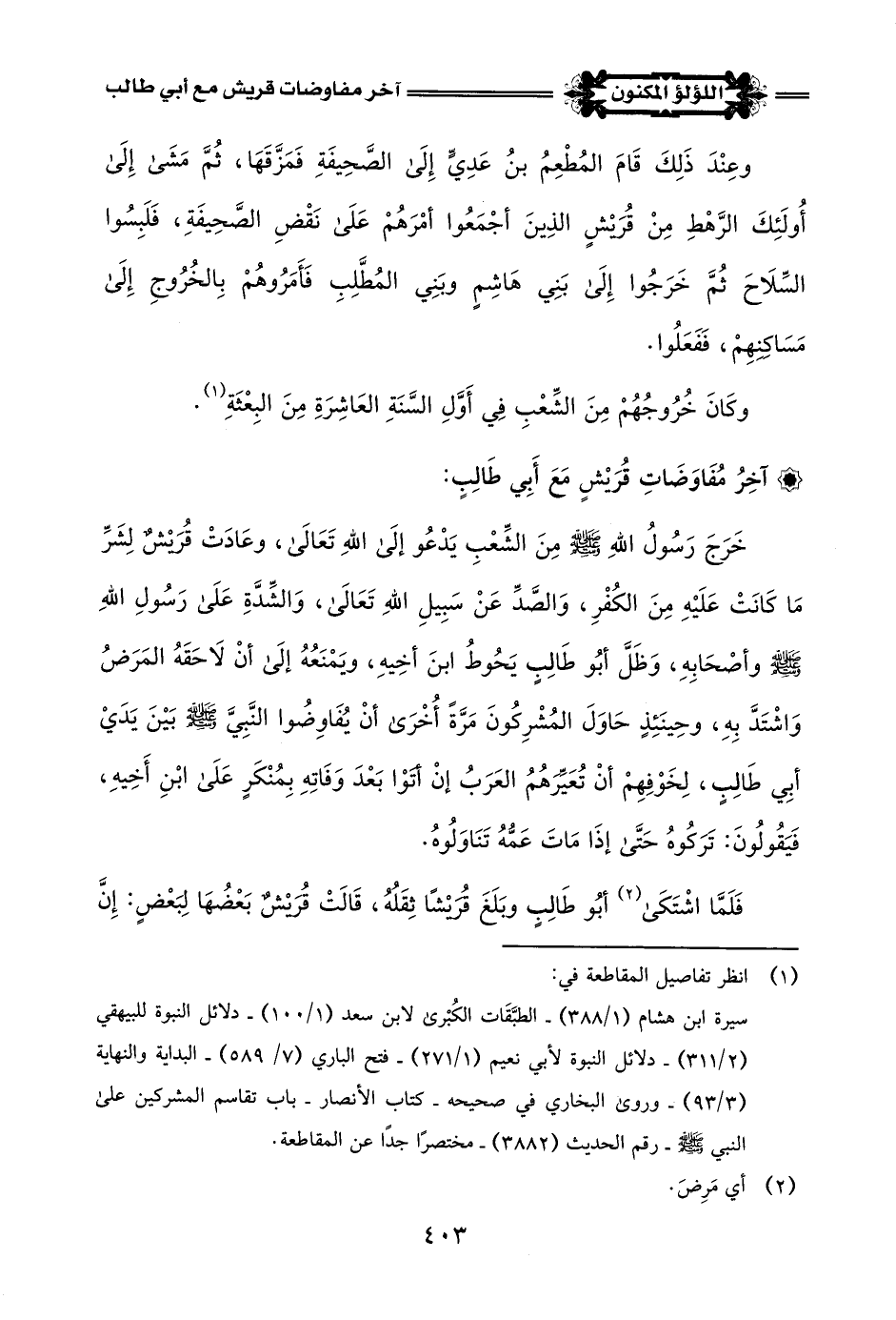 وكَانَ خُرُوجُهُمْ مِنَ الشِّعْبِ في أَوَّلِ السَّنَةِ العَاشِرَةِ مِنَ البِعْثَةِ (¬1).