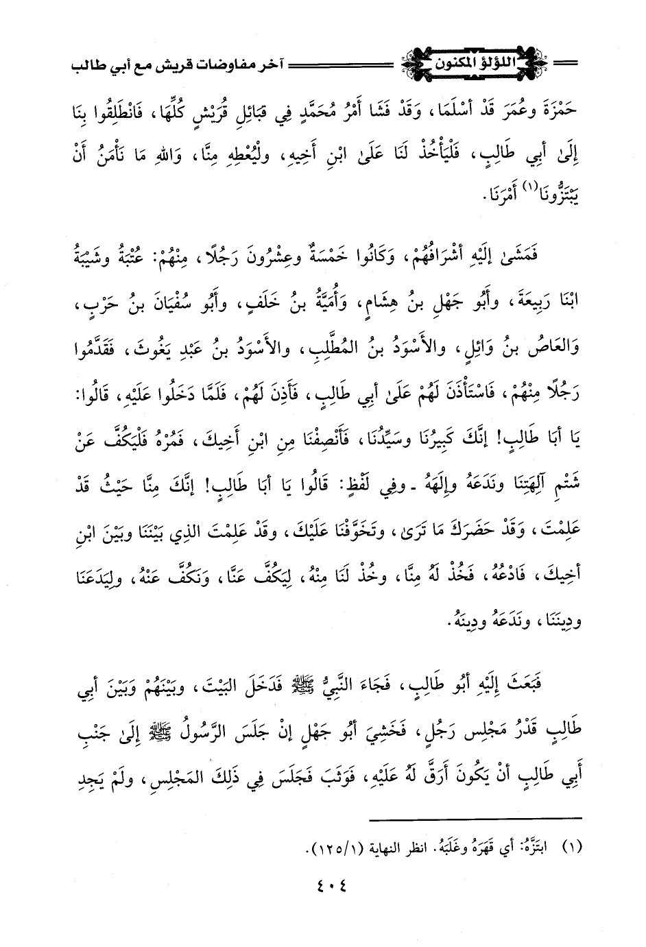 حَمْزَةَ وعُمَرَ قَدْ أسْلَمَا، وَقَدْ فَشَا أَمْرُ مُحَمَّدٍ في قبائِلِ قُرَيْشٍ كُلِّهَا، فَانْطَلِقُوا بِنَا إِلَى أَبِي طَالِبٍ، فَلْيَأْخُذْ لَنَا عَلَى ابْنِ أَخِيهِ، ولْيُعْطِهِ مِنَّا، وَاللَّهِ مَا نَأْمَنُ أَنْ يَبْتَزُّونَا (¬1) أَمْرَنَا.
