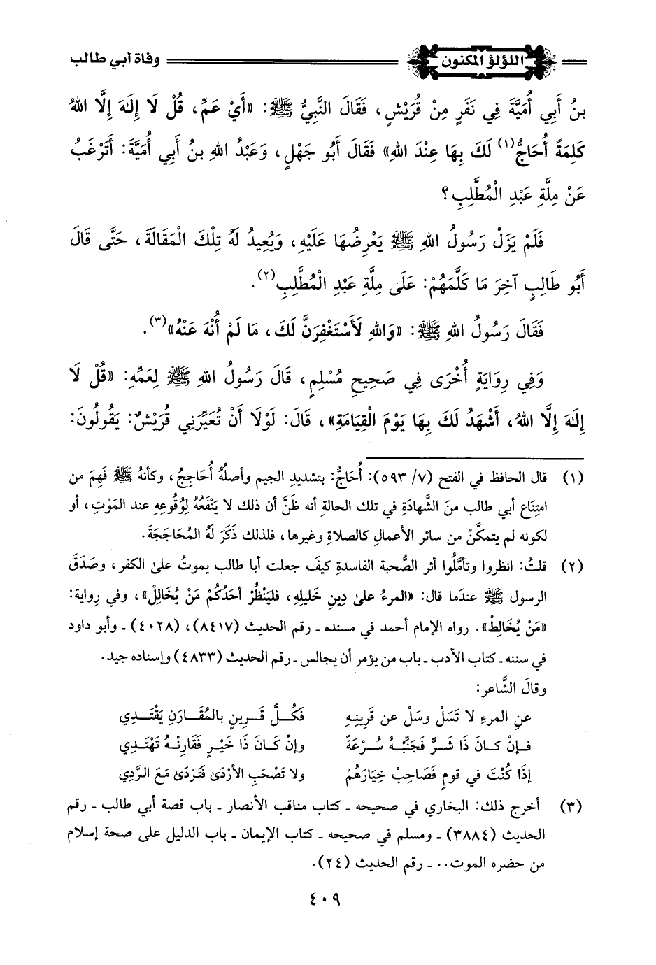 (¬3) أخرج ذلك: البخاري في صحيحه - كتاب مناقب الأنصار - باب قصة أبي طالب - رقم الحديث (3884) - ومسلم في صحيحه - كتاب الإيمان - باب الدليل على صحة إسلام من حضره الموت. . - رقم الحديث (24).